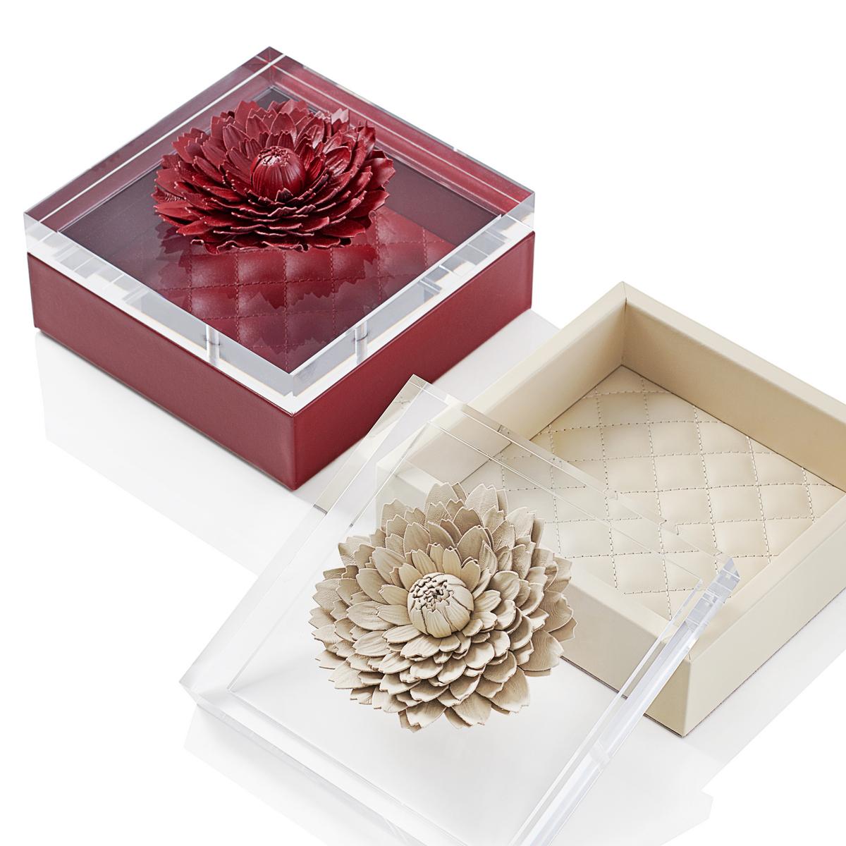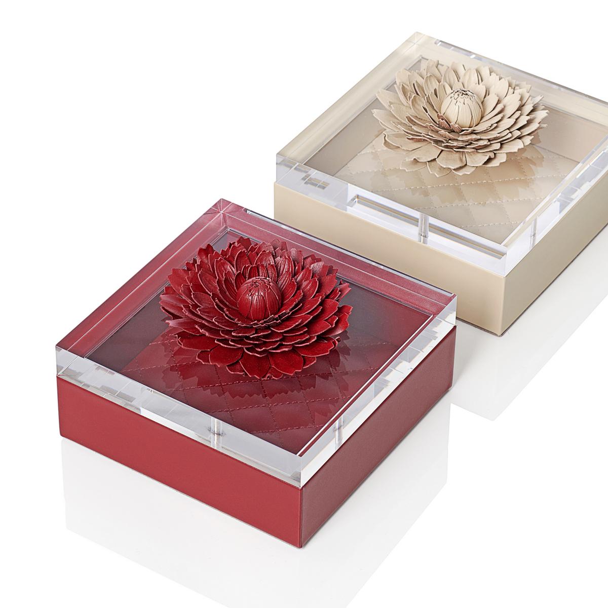 The "Dahlia" boxes are made of Nappa leather and have an acrylic lid, which has been refined with a flower made of hand-sewn leather. They are completely handcrafted by the Italian manufacturer Riviere.