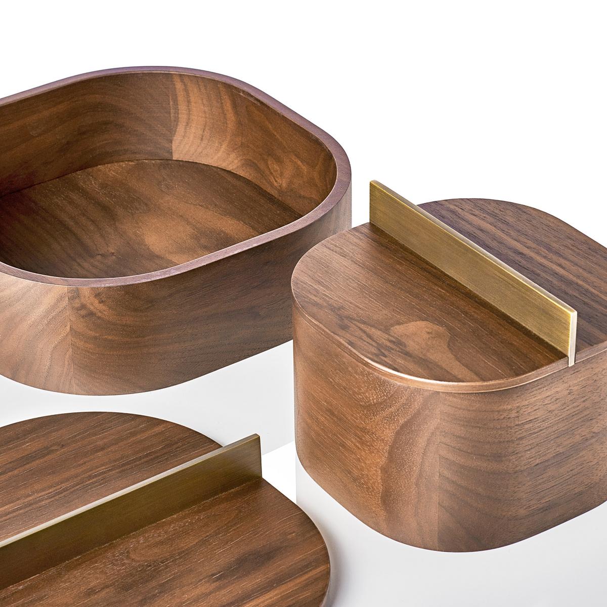 Material and design in perfect harmony. The "Dama" rounded boxes by Riviere grace your interiors with strict geometry, surprising details and unparalleled craftsmanship. Riviere crafts the boxes in Italy from solid Canaletto walnut wood. Intricate hand polishing makes the warm precious wood smooth and brilliant, revealing the full beauty of its grain. Brushed brass handles blend harmoniously with the natural textures of the wood. Masterpieces of modern joinery, the boxes are resistant to dirt and moisture.