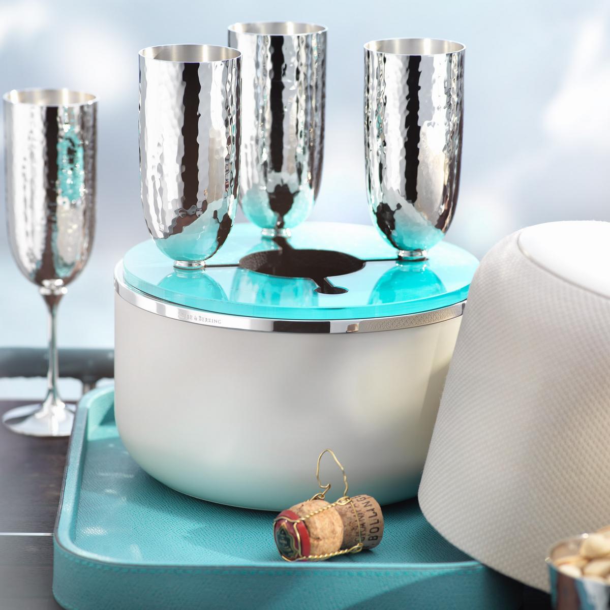 "The Box Cream" by Robbe & Berking is a real centrepiece: 4 silverplated "Martelé" Champagne flutes beautifully rest inside the cream-coloured case, firmly held in place by an ice blue acrylic board.