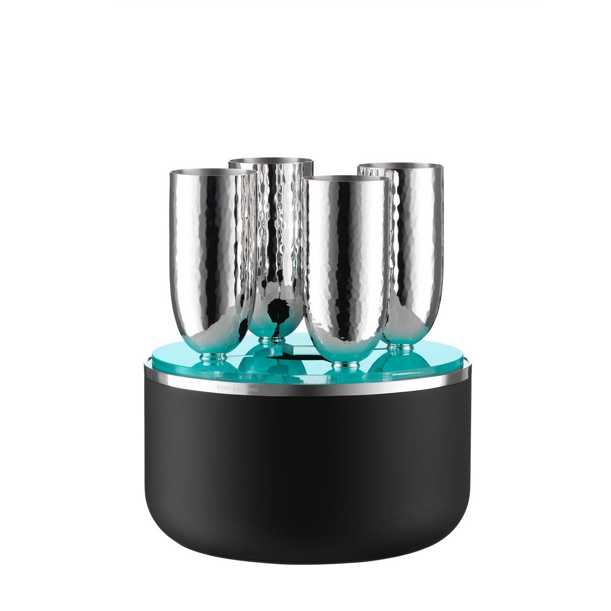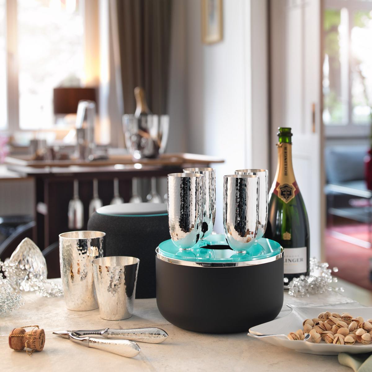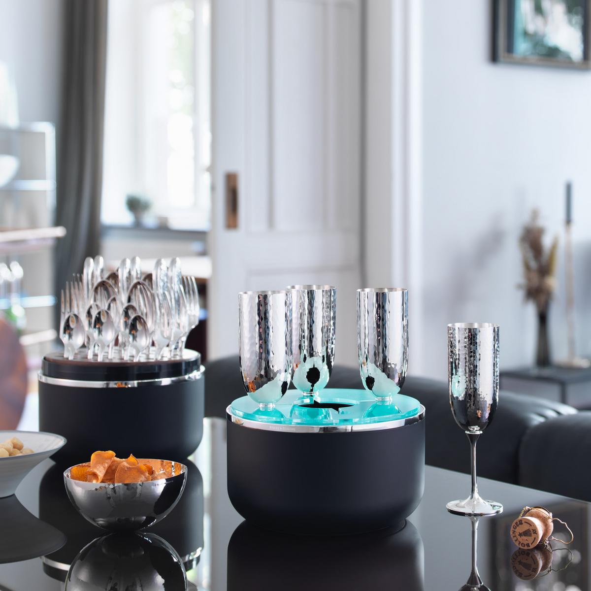 "The Box" by Robbe & Berking is a real centrepiece: 4 silverplated "Martelé" Champagne flutes beautifully rest inside the case, firmly held in place by an ice blue acrylic board.