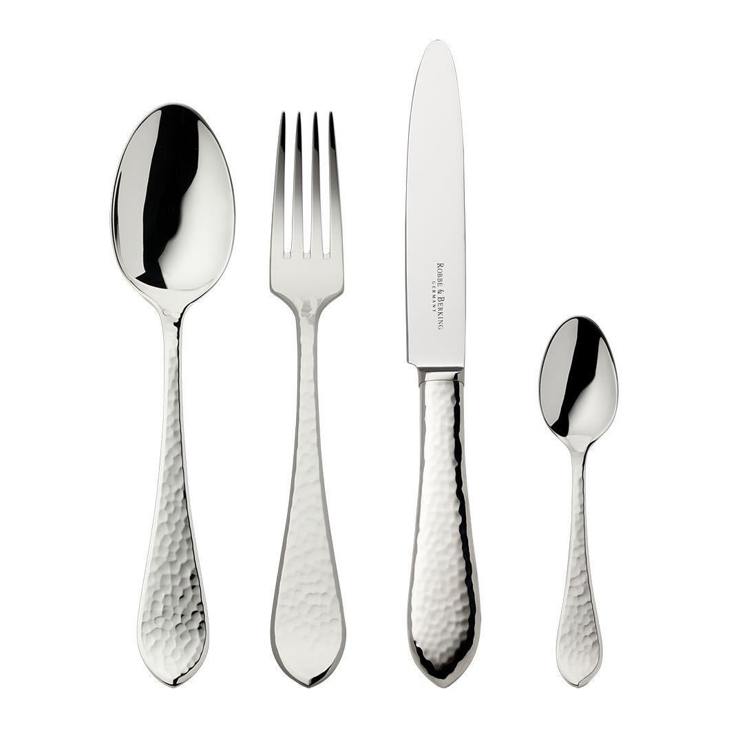 Robbe & Berking has introduced a nice new effect with the gleaming surface of the "Martelé" flatware. The softly curved cutlery reflects the light in a myriad of ways, giving it an air of surprising lightness. The refined structures, which were inspired by the movement of the waves, are attained using a finely modulated hammering technique. “Martelé” shows the artistic skills of the Robbe & Berking silversmiths, skills which have been passed down from generation to generation.