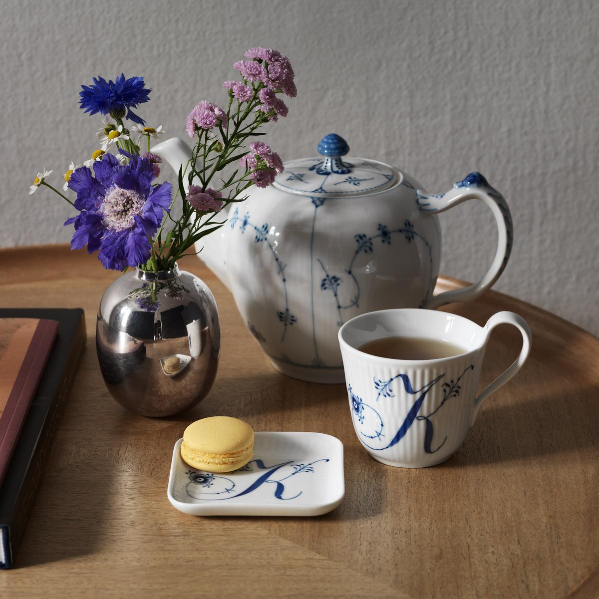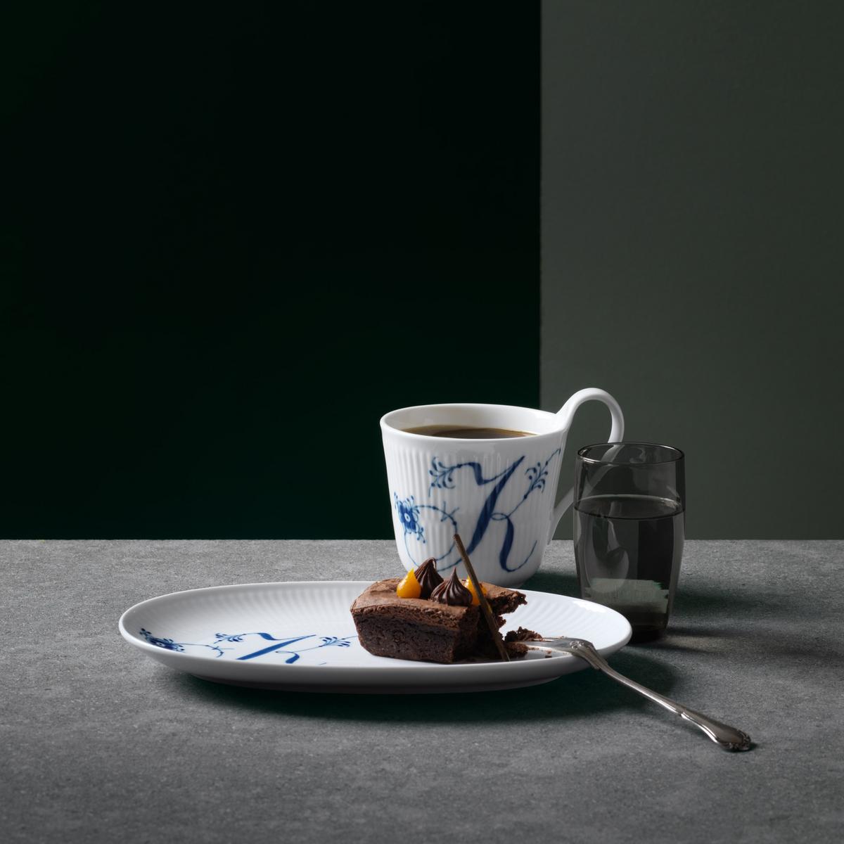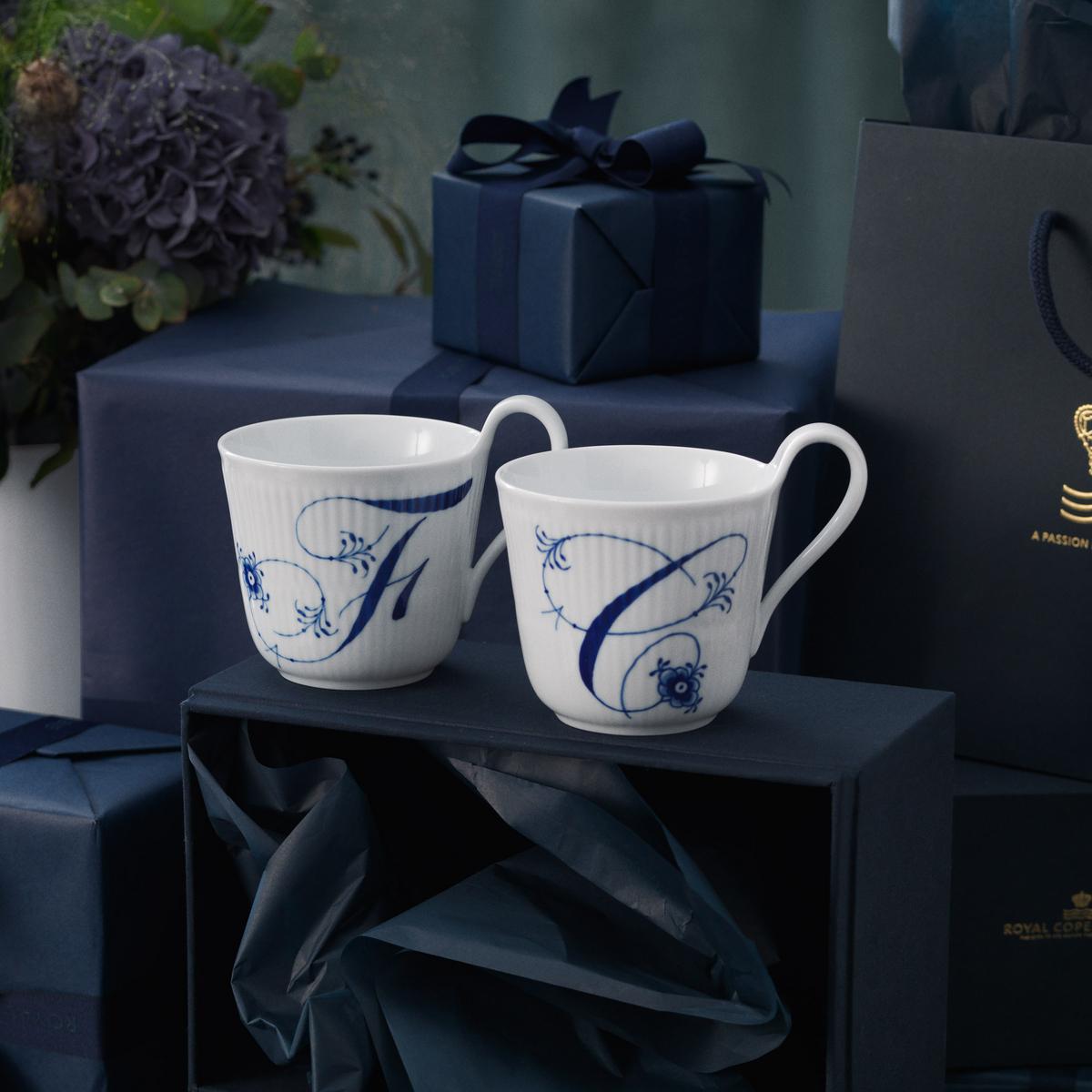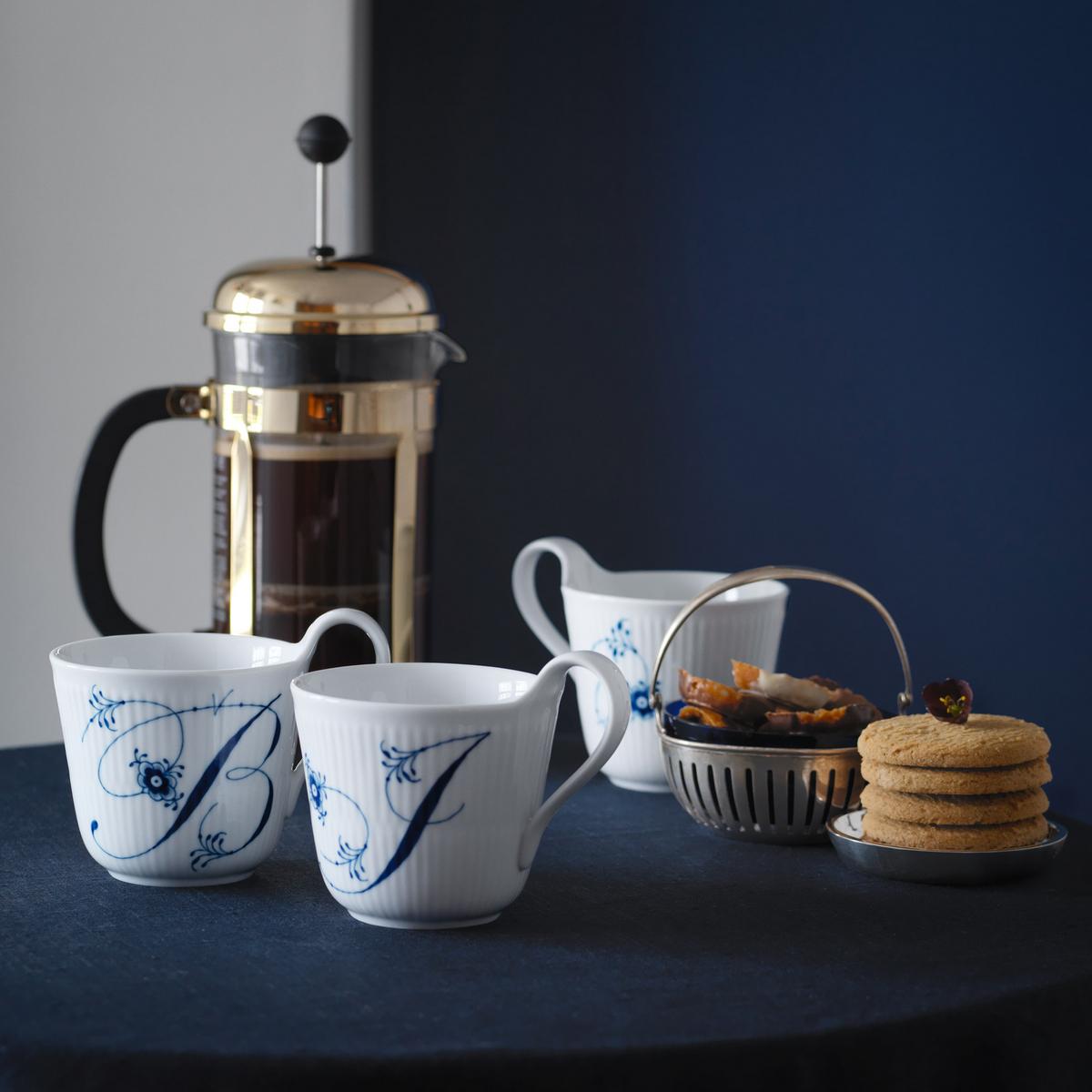 "Blue Fluted Plain" was the very first porcelain collection by Royal Copenhagen and has been part of the catalogue since 1775. The elegant, high handles of the porcelain mugs offer great comfort when drinking warm beverages. The playful letter motifs add a modern touch to the traditional shape.