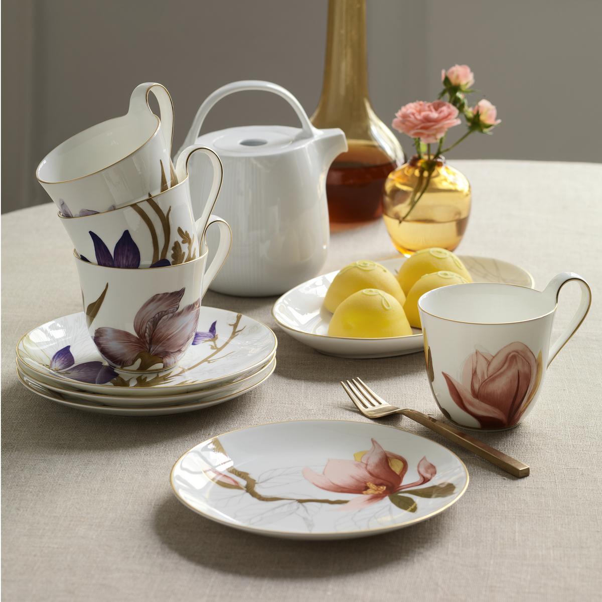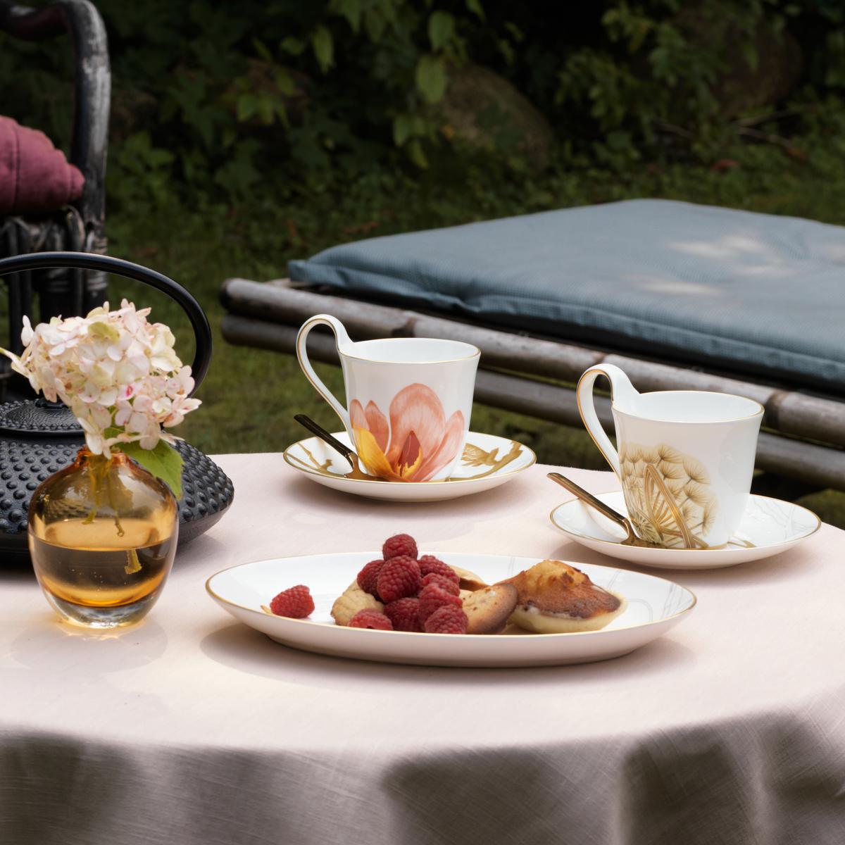 Spend sunny summer hours in the garden with "Flora" at breakfast or afternoon tea. The high handles of the cups are particularly comfortable when drinking hot beverages. As decorative elements, individual pieces from the collection fill your rooms with a spring-like atmosphere.