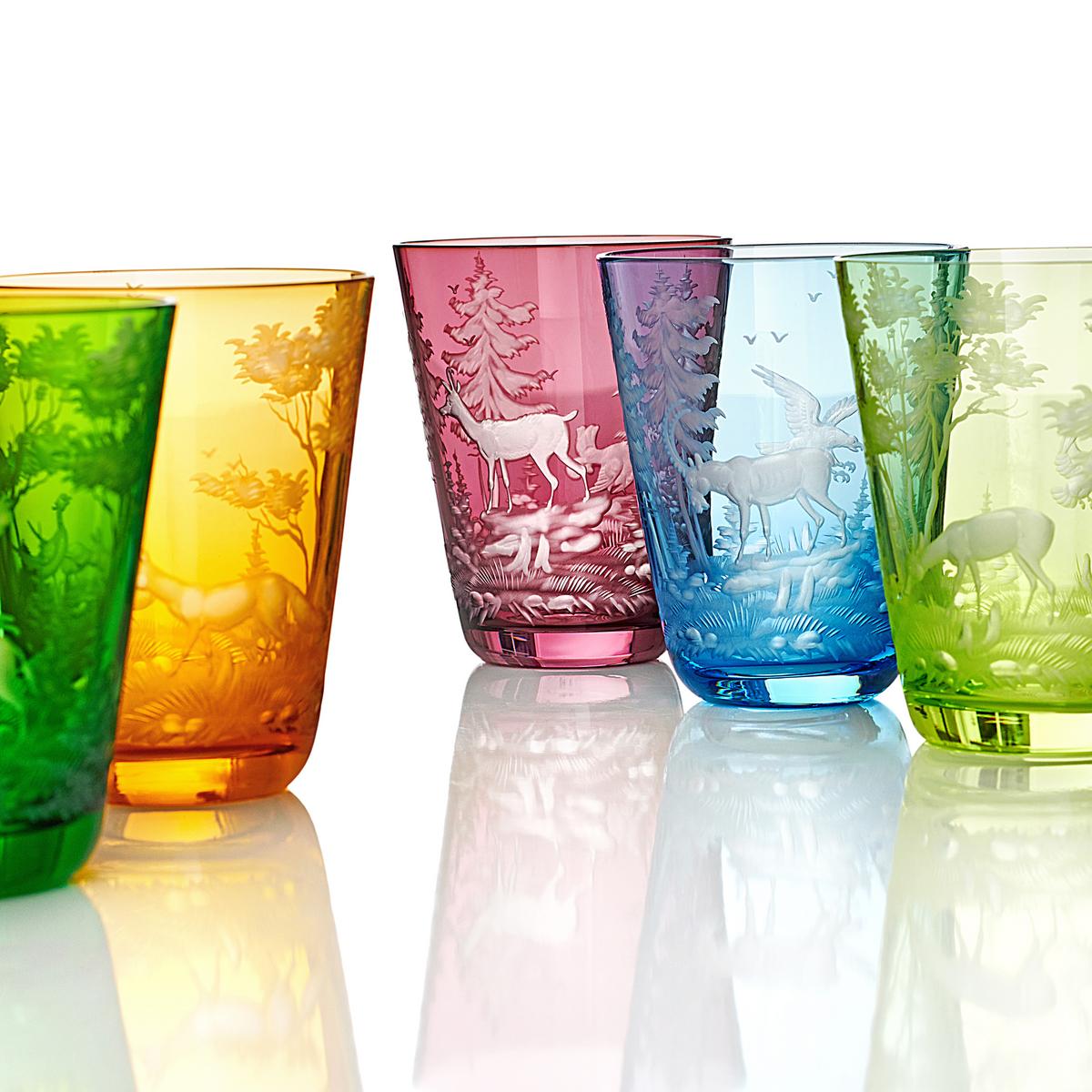 The colourful "Schliersee" tumblers from Theresienthal are engraved with wild animals from Europe. Deer, fox and ibex can be discerned in the luminous colours. The special production method makes the animals look particularly vivid and alive.