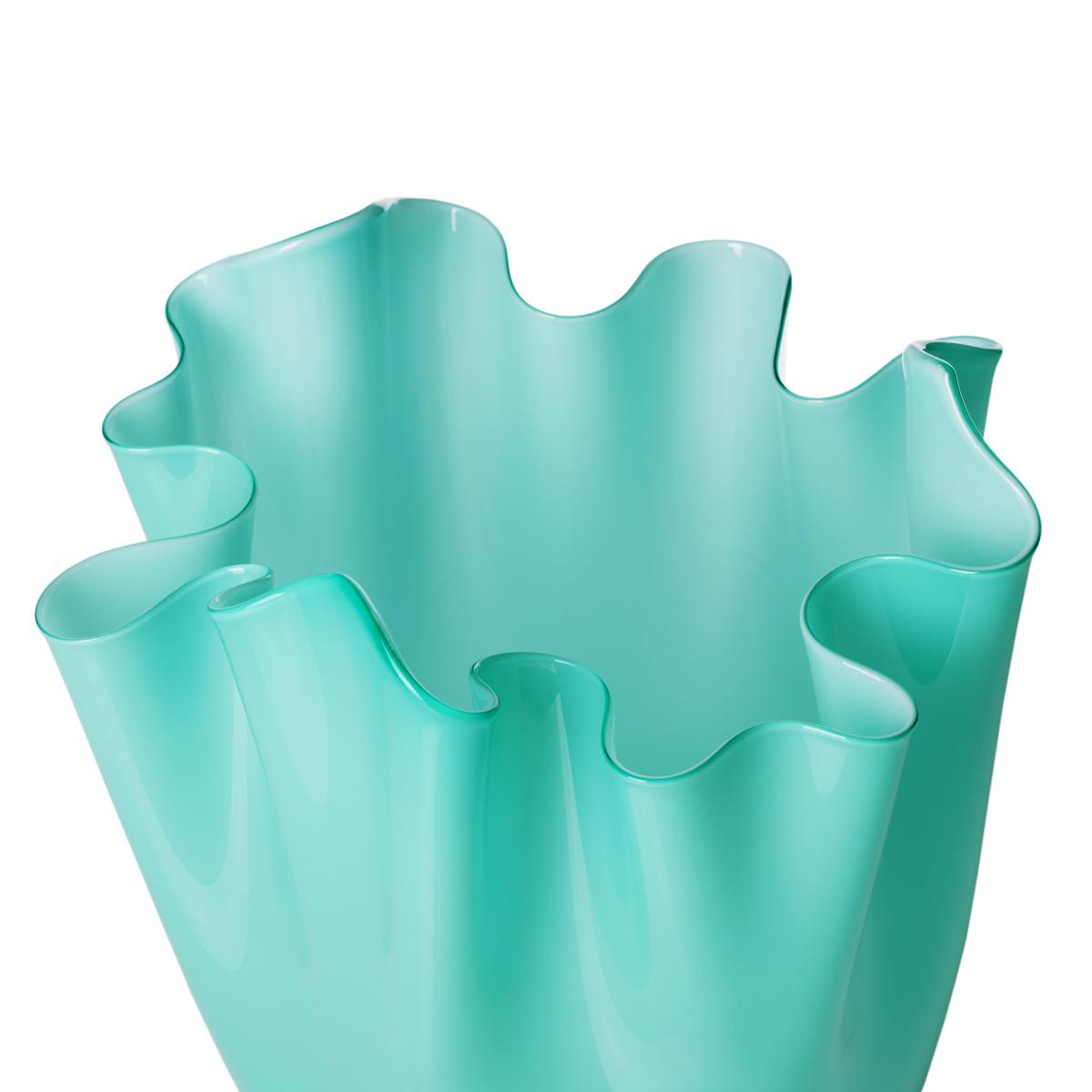 The production of a vase "Fazzoletti Opalino" in mint green requires from the Venini glassblowers particularly great skill and sensitivity. When the glass master has blown a ball of molten glass, he cuts it open. With a skilled swinging motion, the craftsman forms the vases into a shape that resembles a bunched handkerchief. This also explains the name: "Fazzoletti" means handkerchief in Italian. Each vase from Venini is handmade and thus quite unique.