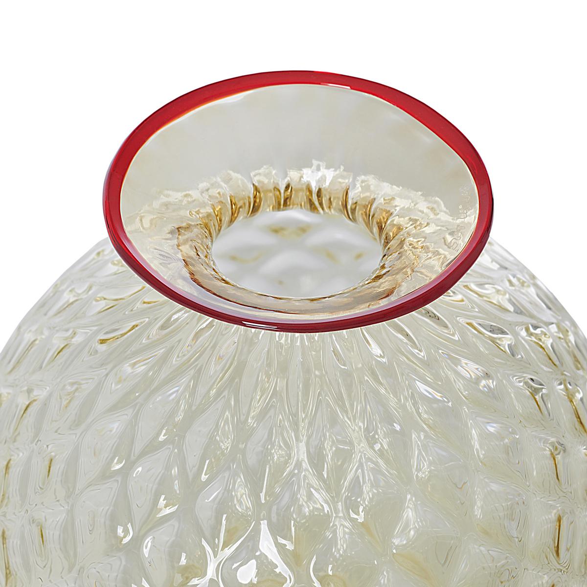 Venini’s "Monofiori Balloton" vases in straw yellow are an absolute classic from Venini. A distinctive feature of the wide-bellied Murano glass vase is the red line around its neck. The coloured glass ring is a result of the so-called "Balloton" technique. In order to produce it, a glass thread is applied when hot on the top of the "Monofiori Balloton" Venini vase. This forms a pretty contrast to the round-shaped body of the Murano glass vase.