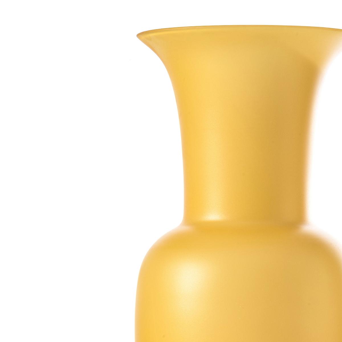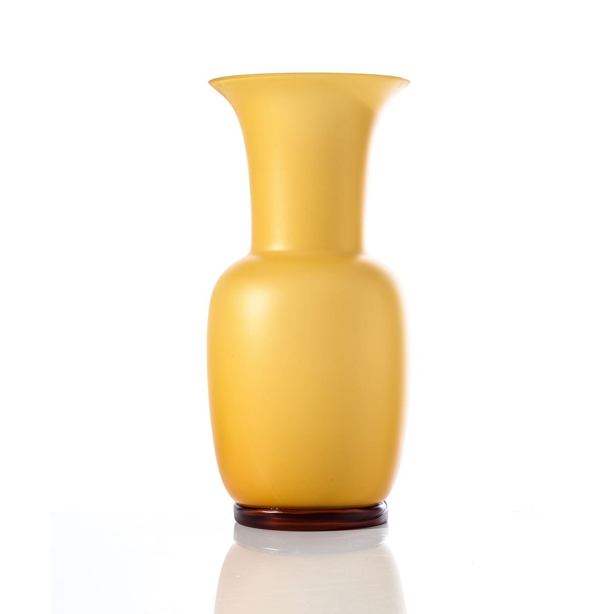 Discover Murano glass from its silky side. Venini gives the "Opalino" vases in the colour ambra a matt sandblasted surface for a mysterious shine. The Opalino vases have a layer of white glass on the inside to achieve the famous brilliance of the Venini glass colours. Venini manufactures the iconic trumpet vases purely by hand on the island of Murano in the lagoon of Venice. The amber colour ambra invigorates the vases with a bright and extravagant character.