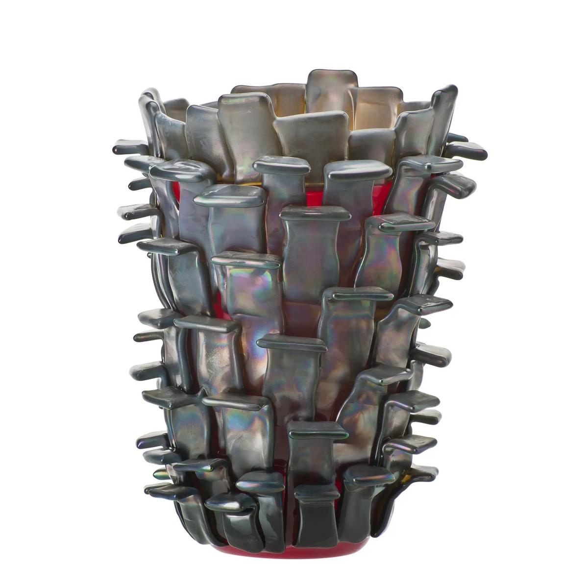 The "Ritagli" vases were designed by Fulvio Bianconi, one of the most innovative and influential Italian designers of glass objects of the 20th century. He also devised the manufacturing technique, in which rectangular glass plates are attached piece by piece to a mouth-blown, conical base. Depending on the colourway, the base and plates have different colours and iridescent surfaces that amplify the mystical elegance of the vases with their colourful shimmer.