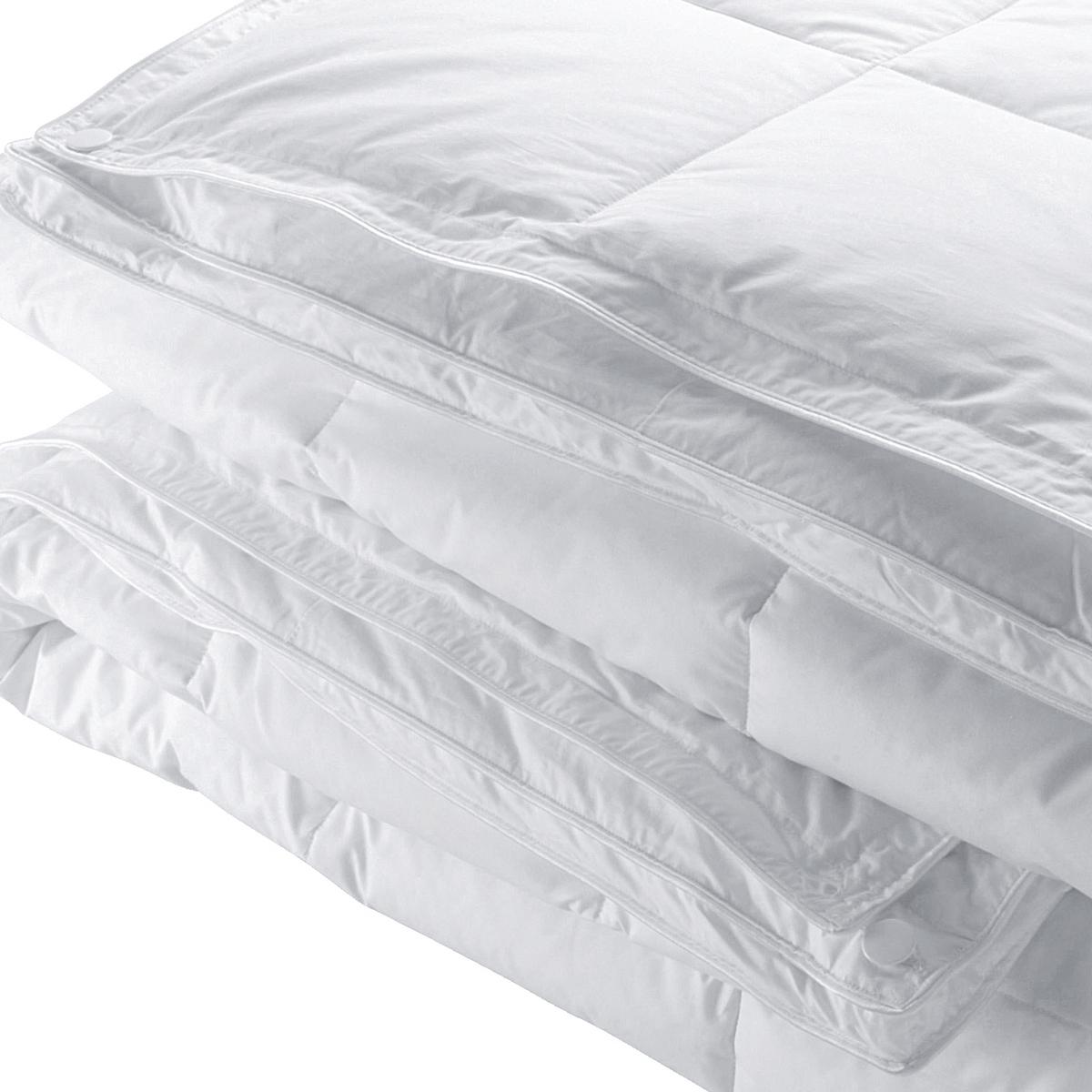 Yves Delorme's "4-Seasons" double duvet consists of two duvets: a light duvet for summer (90 g/m² down filling) and a slightly heavier duvet for spring/autumn (180 g/m² down filling). The combination of both duvets ensures a cuddly warm duvet in winter. Buttonholes and fixed buttons make it possible to fix both duvets together.