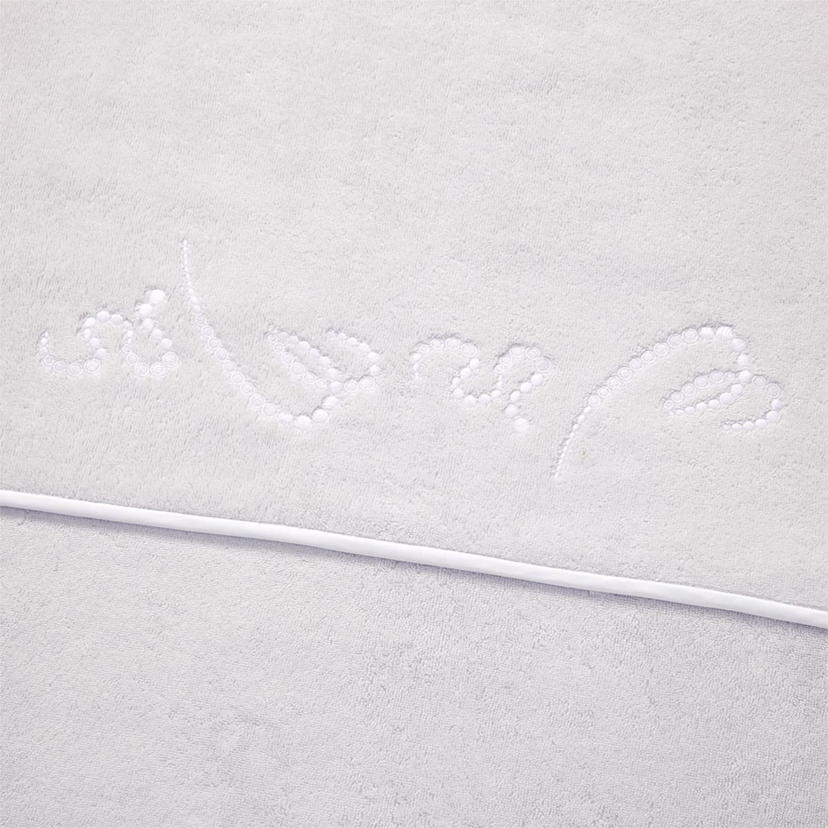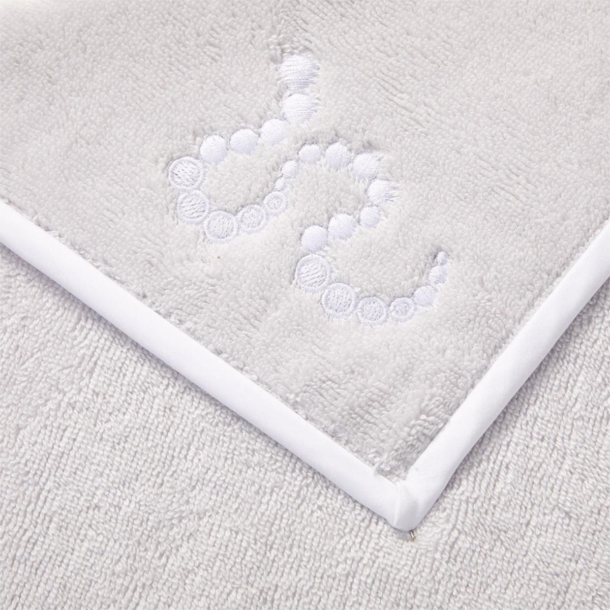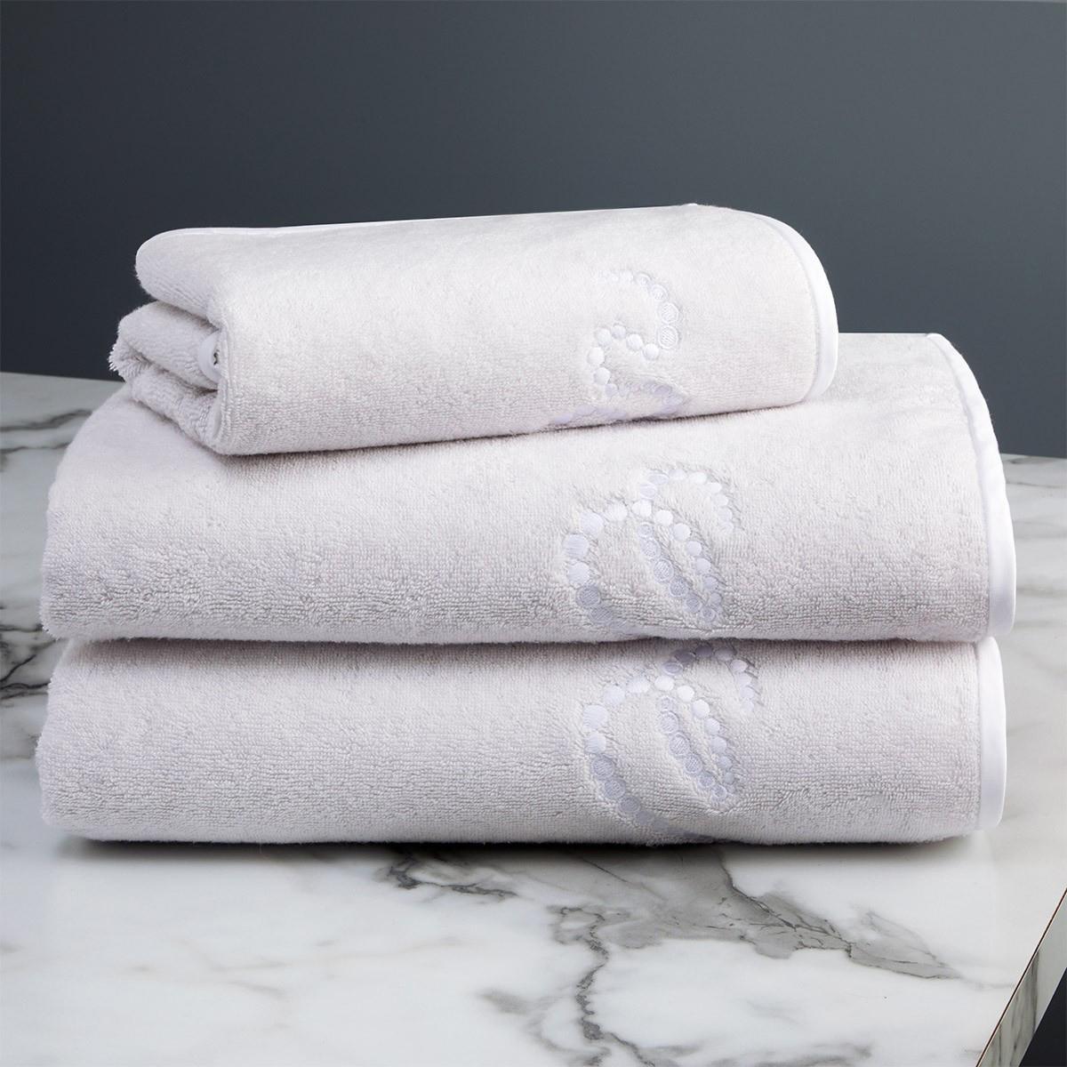 The "Ballet" terry towels by Yves Delorme Couture captures French artistry with delicate embroidery inspired by the dance steps of the Sun King. In this refined version, subtle pearl-grey terry meets pure white embroidery, evoking the elegance and rhythm of a royal ballet in a softer, more understated interpretation.
