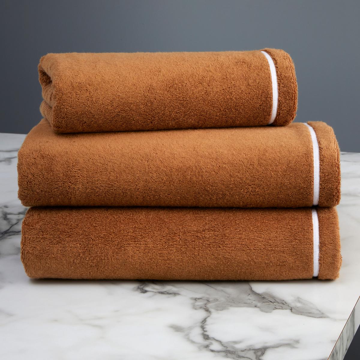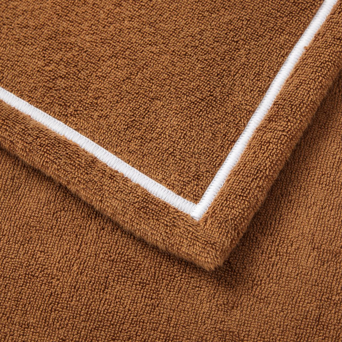 The "Duetto" terry towels by Yves Delorme Couture in Camel embody both warmth and elegance. The rich hue is highlighted by a fine white border, accentuating the clean design and giving the towels a luxurious, contemporary look.