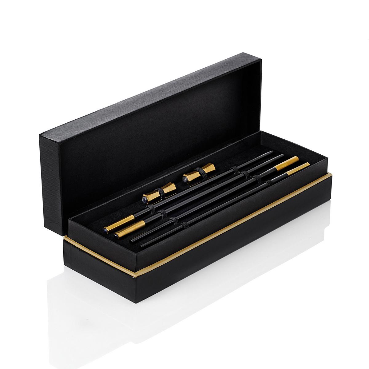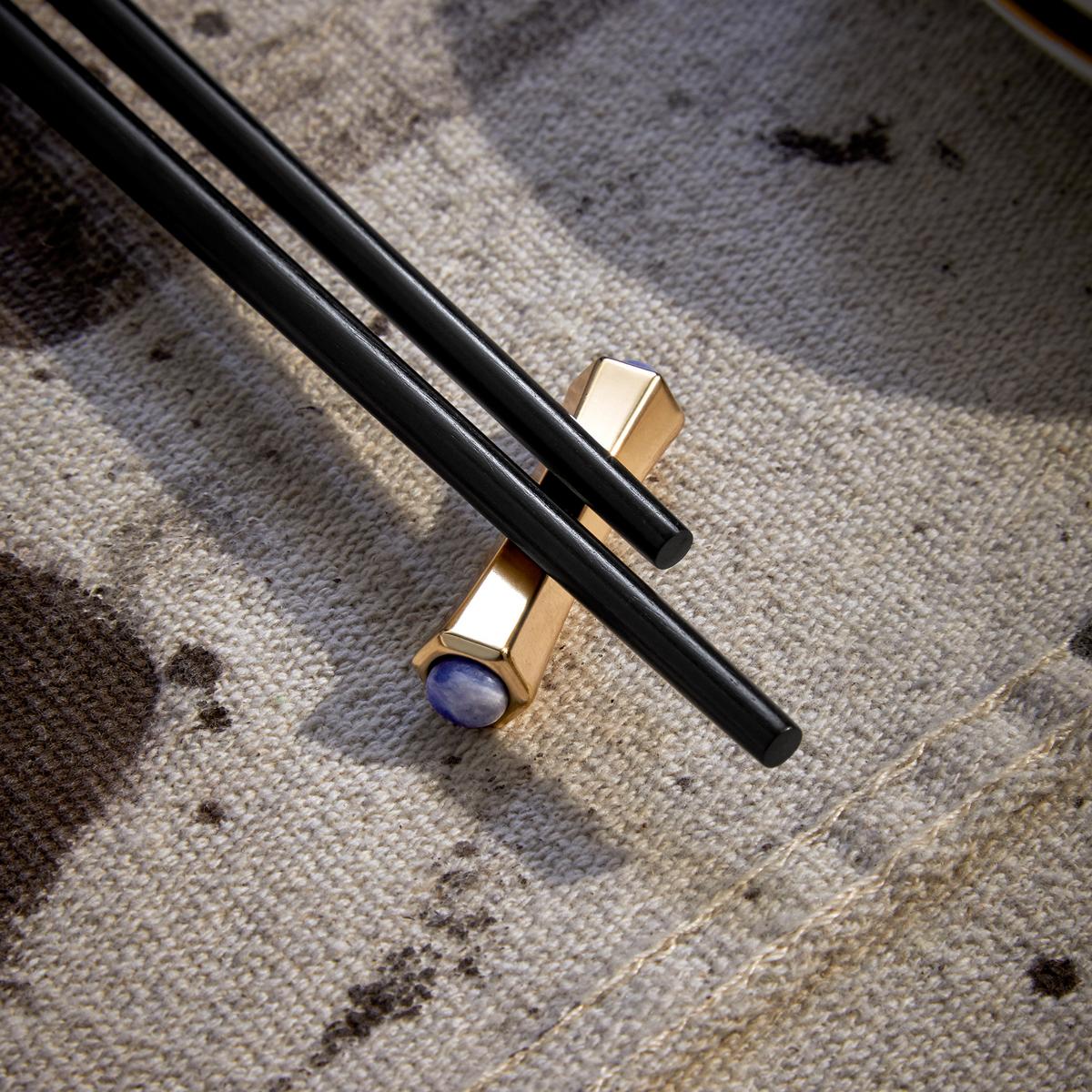 The "Zen" chopsticks by L'Objet are particularly elegant. The black-gold colour combination, the refinement with real 24 carat gold and a blue semi-precious stone make the chopsticks a real eye-catcher on a dining table.