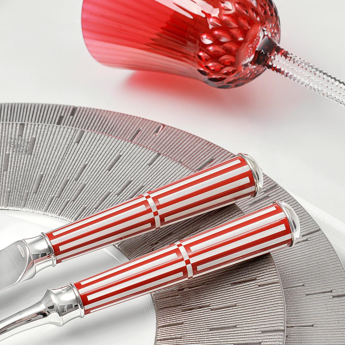 For its "Arts Decoratifs" collection, Ercuis has drawn the most technically accomplished and sophisticated expertise available. Each piece of cutlery goes through several stages of manufacturing. The flatware is lacquered in pure and luminous colours before being engraved with one of the nine guilloche patterns. Each part is then silverplated or goldplated in the silversmith's workshops, and finally the handles are coated with a protective lacquer.