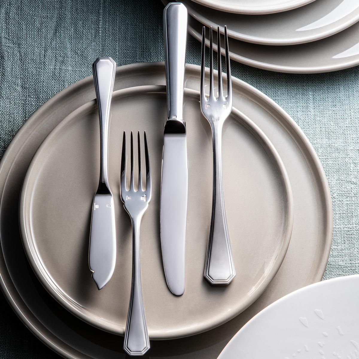 The design for the silverplated "America" cutlery from Christofle dates back to 1933. The cutlery in Art Deco style displays the angled corners and tapered edges typical of the architectural style of the 1930s.