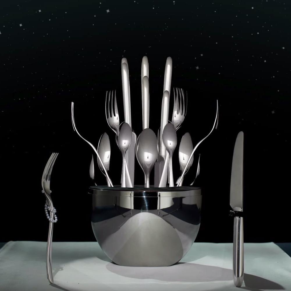 This design egg from Christofle is like a surprise egg. In the chic, gleaming receptacle of copper-coloured stainless steel is a 24-piece cutlery set from Christofle. Christofle’s "Mood Precious" cutlery is silverplated and its pleasingly shaped handles feel very comfortable to hold. The coffee spoon is particularly eye-catching as it is extra refined with (18-carat) pink gold.