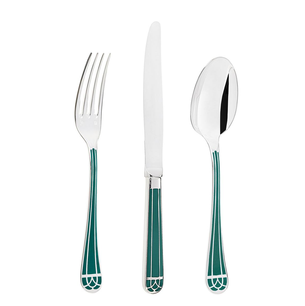 We offer the "Talisman" silverplated cutlery with green lacquer. Christofle also offers the possibility to personalize this flatware with other colours. initials, coat of arms or logos. Please contact us.