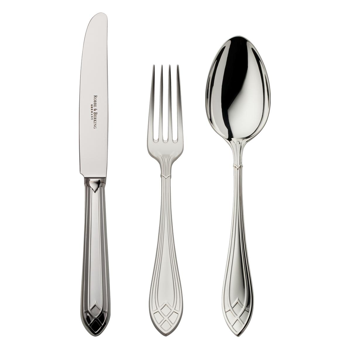 The design for the "Arcade" cutlery from Robbe & Berking is reminiscent of Mediterranean arcades in a summery light. Its combination of exquisite form and appealing appearance makes this silverplated "Arcade" cutlery from Robbe & Berking a particularly festive flatware. The handles of the collection taper off into a point. A delicate V-shaped band adorns each handle.