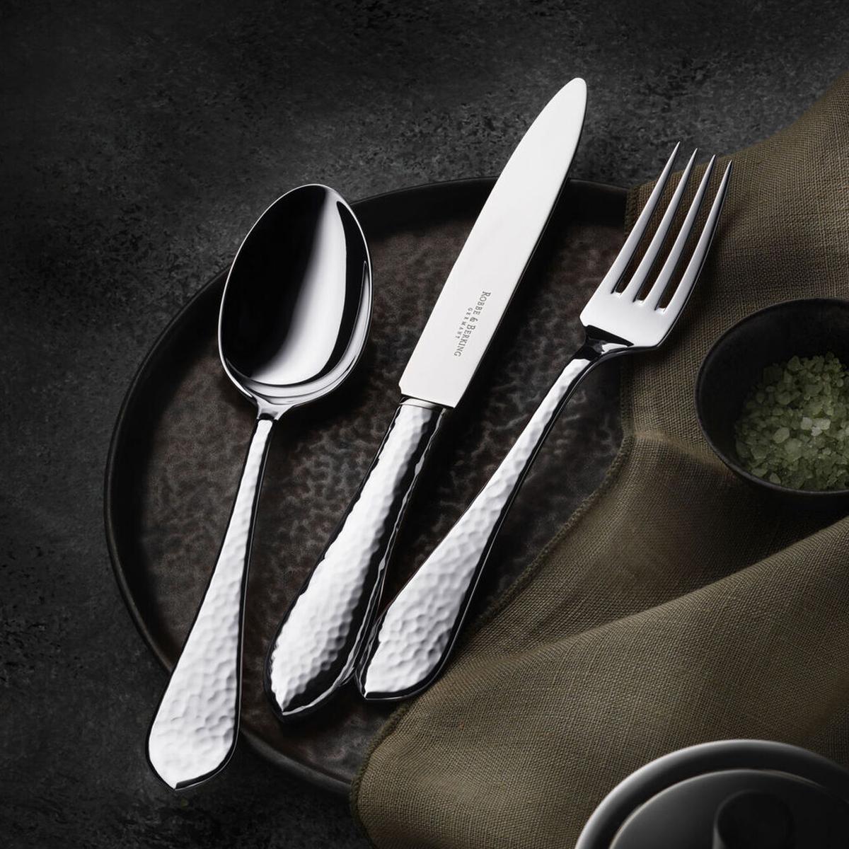 Robbe & Berking has introduced a nice new effect with the gleaming surface of this flatware. The softly curved cutlery reflects the light in a myriad of ways, giving it an air of surprising lightness. The refined structures, which were inspired by the movement of the waves, are attained using a finely modulated hammering technique. “Martelé” shows the artistic skills of the Robbe & Berking silversmiths, skills which have been passed down from generation to generation. Silverplated cutlery by Robbe & Berking is manufactured using 150g silver. This robust silver plate is particularly resistant and is completely dishwashable.
