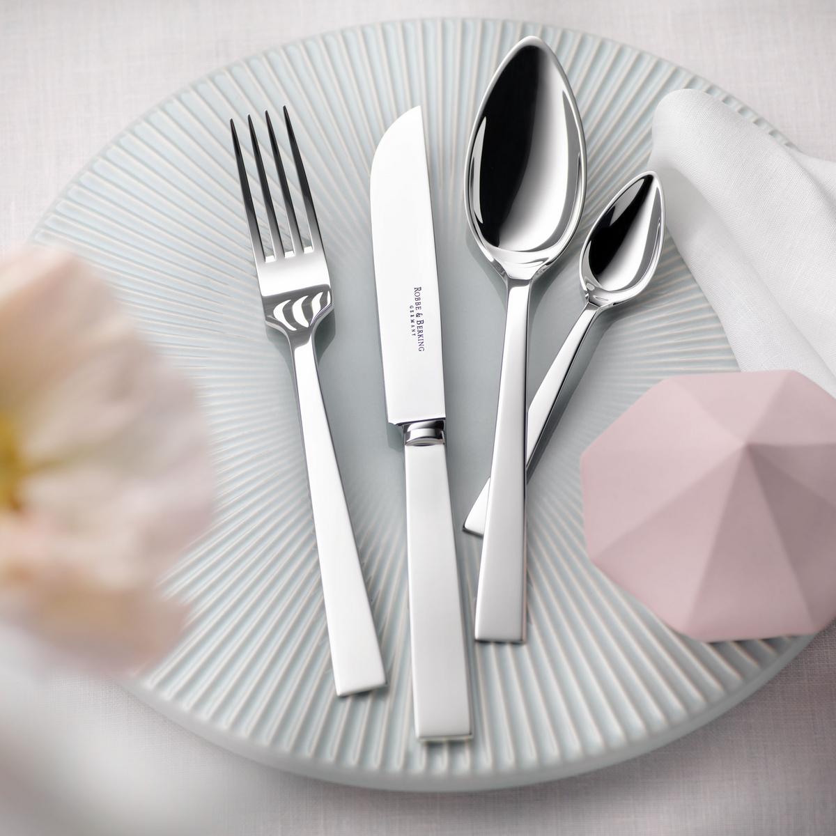 A modern and unique masterpiece: Robbe & Berking’s "Riva" cutlery was not just the brainchild of the famous silversmith Wilfried Moll, the versatile artisan was also responsible for transforming this idea, like so many others, into a fantastic innovation with his silver hammer. This sensational use of material is only possible with cutlery made of silver. Silverplated cutlery by Robbe & Berking is manufactured using 150g silver. This robust silver plate is particularly resistant and is completely dishwashable.