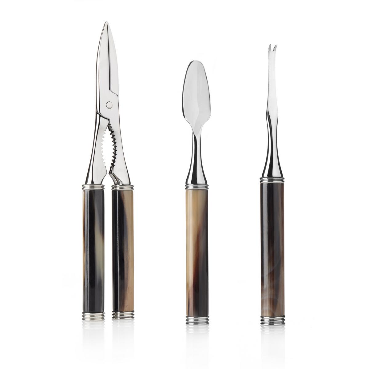 Exclusive dishes need exclusive cutlery - including lobster, a coveted delicacy and classic "difficult dish". The "Palinuro" lobster cutlery by Arcahorn helps you to obtain the delicious meat of the crustacean with minimum effort and maximum elegance. Each utensil, handcrafted and made of horn and stainless steel, is distinguished by impeccable quality and a timeless appeal. Each horn handle is unique in color and grain.