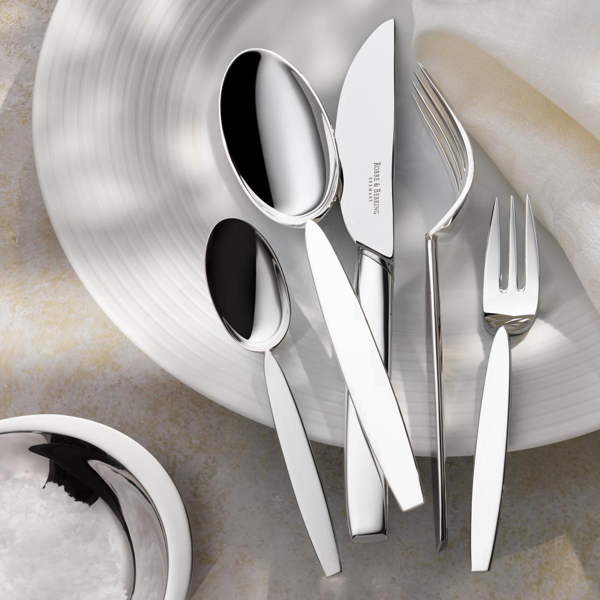 The "12" cutlery from Robbe & Berking in 925 sterling silver has a high level of pure silver and can be put into the dishwasher. The silverplated version of the "12" cutlery is shown below this table.
