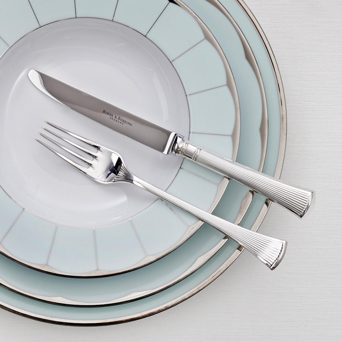 No other material can reflect light so intensively and yet so flatteringly. The 925 Sterling silver cutlery "Avenue" from Robbe & Berking uses these qualities to perfection. The handles are adorned with handcrafted ribs that are reminiscent of the sculptured structure of ancient columns. The structure of the handles creates an attractive interplay of light and shadow.