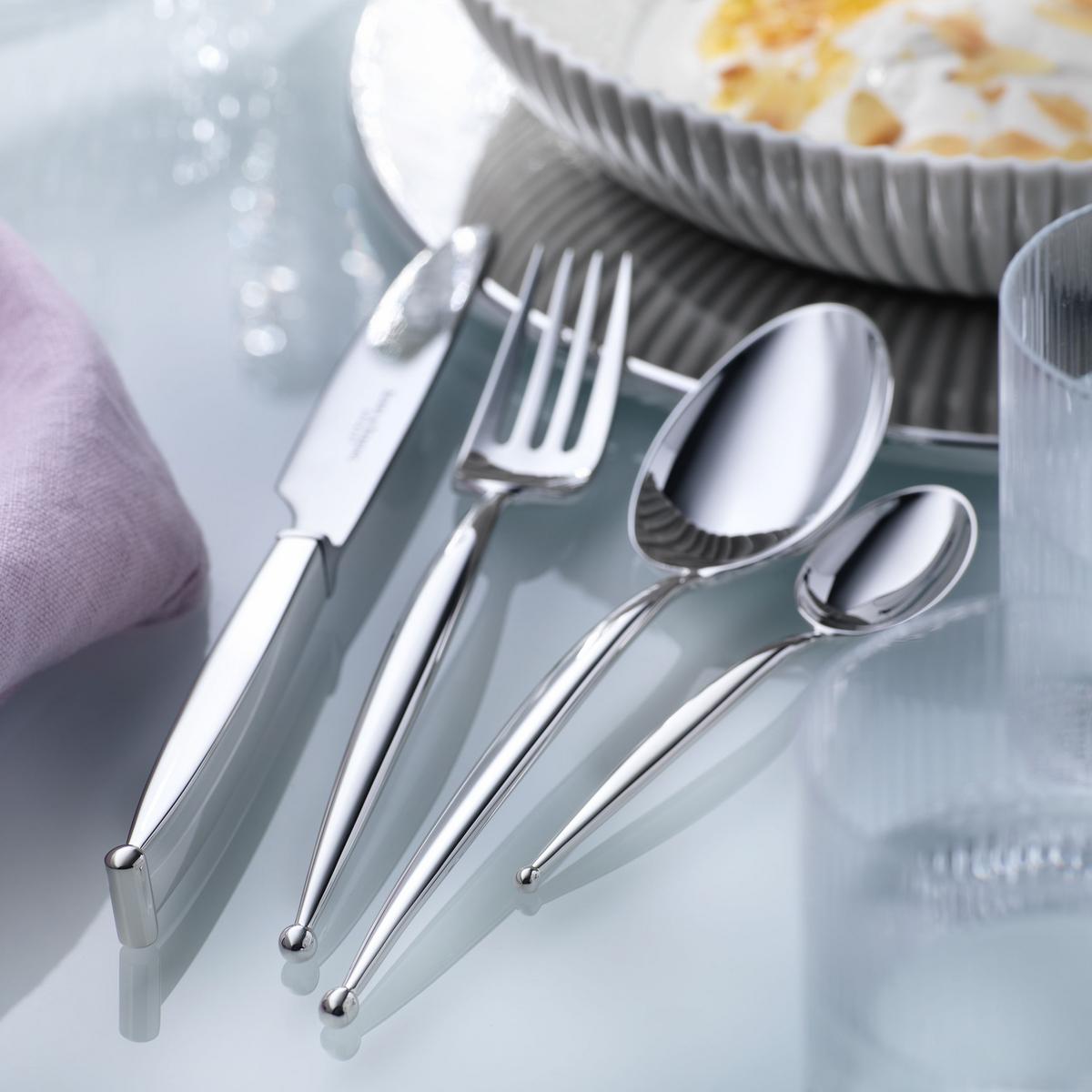 The cutlery series "Gio" from Robbe & Berking shows how different a design by the young Avant-Garde can be. “Gio” is a collection with no rough edges. The elegantly curved handles flow into an orb – the aesthetic highlight of the design. The perfection of the handcraftsmanship together with Robbe & Bering’s uncompromising quest for quality is a guarantee that “Gio” will become a classic of the modern age. The finish in (925) sterling silver guarantees a particularly high level of fine silver and is completely dishwashable.