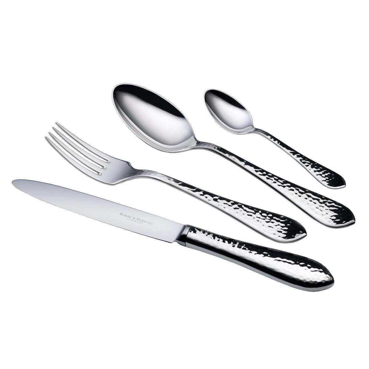 Robbe & Berking has introduced a nice new effect with the gleaming surface of this flatware. The softly curved cutlery reflects the light in a myriad of ways, giving it an air of surprising lightness. The refined structures, which were inspired by the movement of the waves, are attained using a finely modulated hammering technique. “Martelé” shows the artistic skills of the Robbe & Berking silversmiths, skills which have been passed down from generation to generation. The finish in (925) sterling silver guarantees a particularly high level of fine silver and is completely dishwashable.