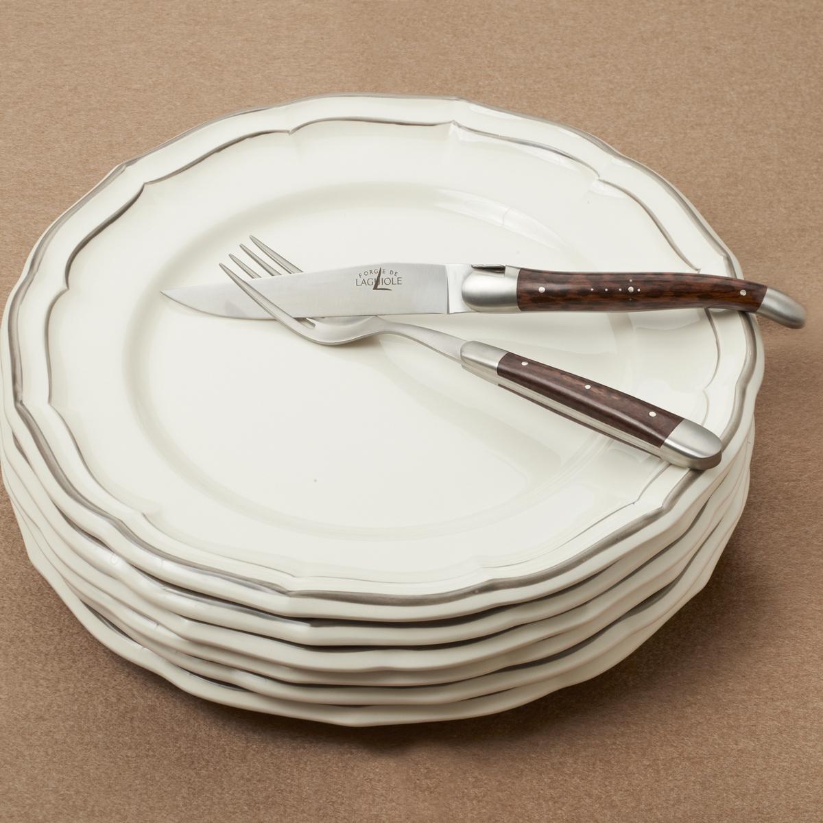 Cutting edge style: high-quality wood-handled knives and forks from Forge de Laguiole. The French cutler has earned a reputation for skilfully forged blades which use T12, a high-grade stainless steel. This process guarantees a very smooth cuting edge.