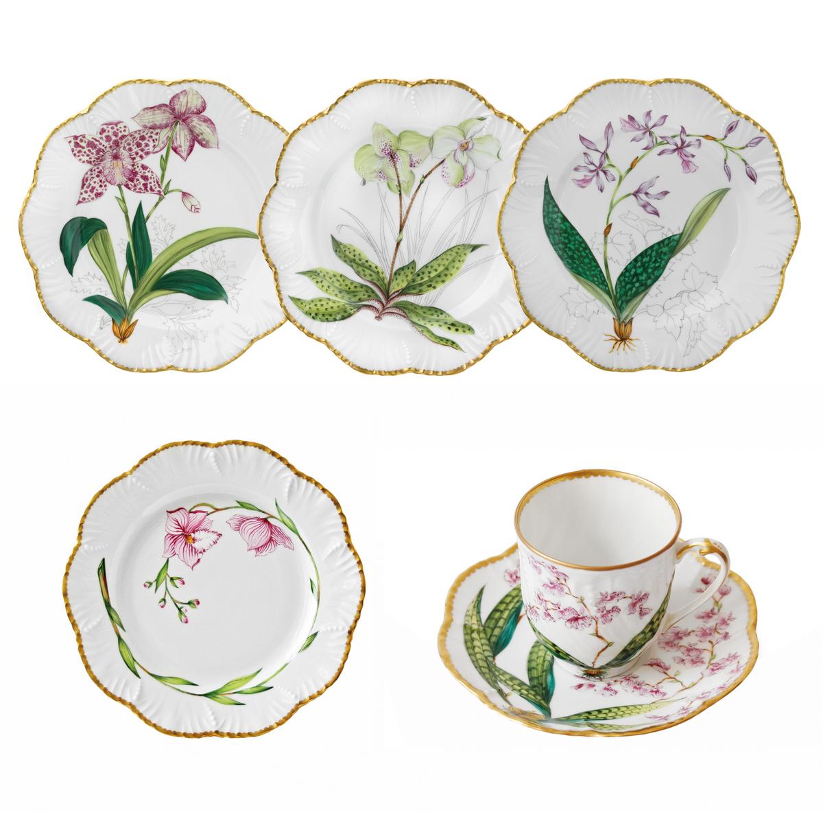 With this partially gilded orchid range, Alberto Pinto has created a particularly exciting floral décor on finest Limoges porcelain.