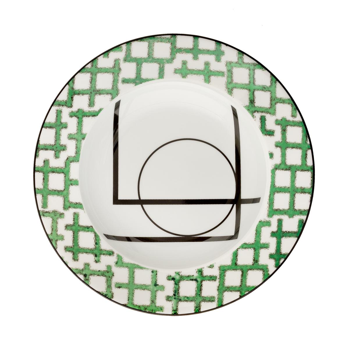 The "Menta" porcelain dinnerware by Alberto Pinto is adorned with a modern and abstract design. It plays with graphic shapes such as circles and right angles. On the rim is a green design reminiscent of a maze. You can choose between six different patterns and thus play with different designs.