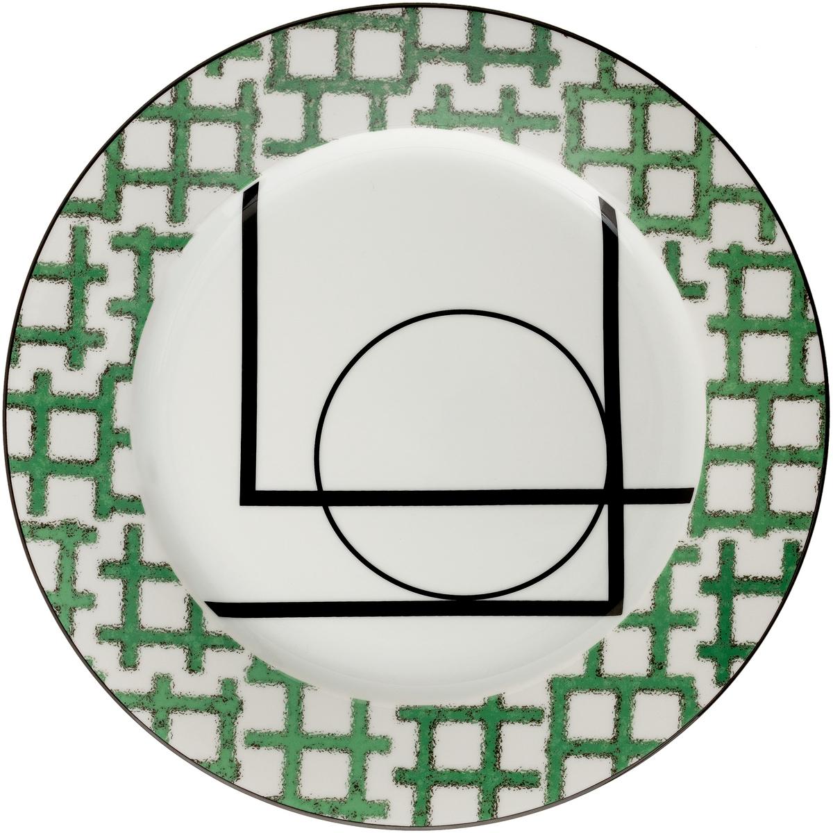 The "Menta" porcelain dinnerware by Alberto Pinto is adorned with a modern and abstract design. It plays with graphic shapes such as circles and right angles. On the rim is a green design reminiscent of a maze. You can choose between six different patterns and thus play with different designs.