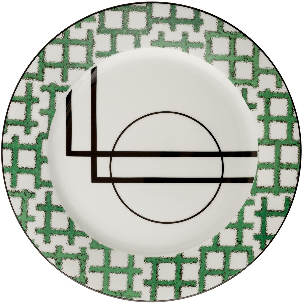 The "Menta" porcelain dinnerware by Alberto Pinto is adorned with a modern and abstract design. It plays with graphic shapes such as circles and right angles. On the rim is a green design reminiscent of a maze. You can choose between six different patterns and thus play with different designs.