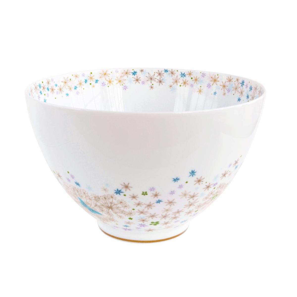 The "Féerie" dinner service by Bernardaud shows a design by the French artist Michaël Cailloux. About the collarboration with Bernaraud the artist says: "I wanted a festive, celestial and solar decor. An explosion of patterns like a firework. With a starry sky of small dandelion flowers, carrot flowers, clovers and wreaths of cherry blossoms. The hummingbird and the butterflies twirl, they are attracted by the light and the gold shards. A moving nature, joyful and bright."