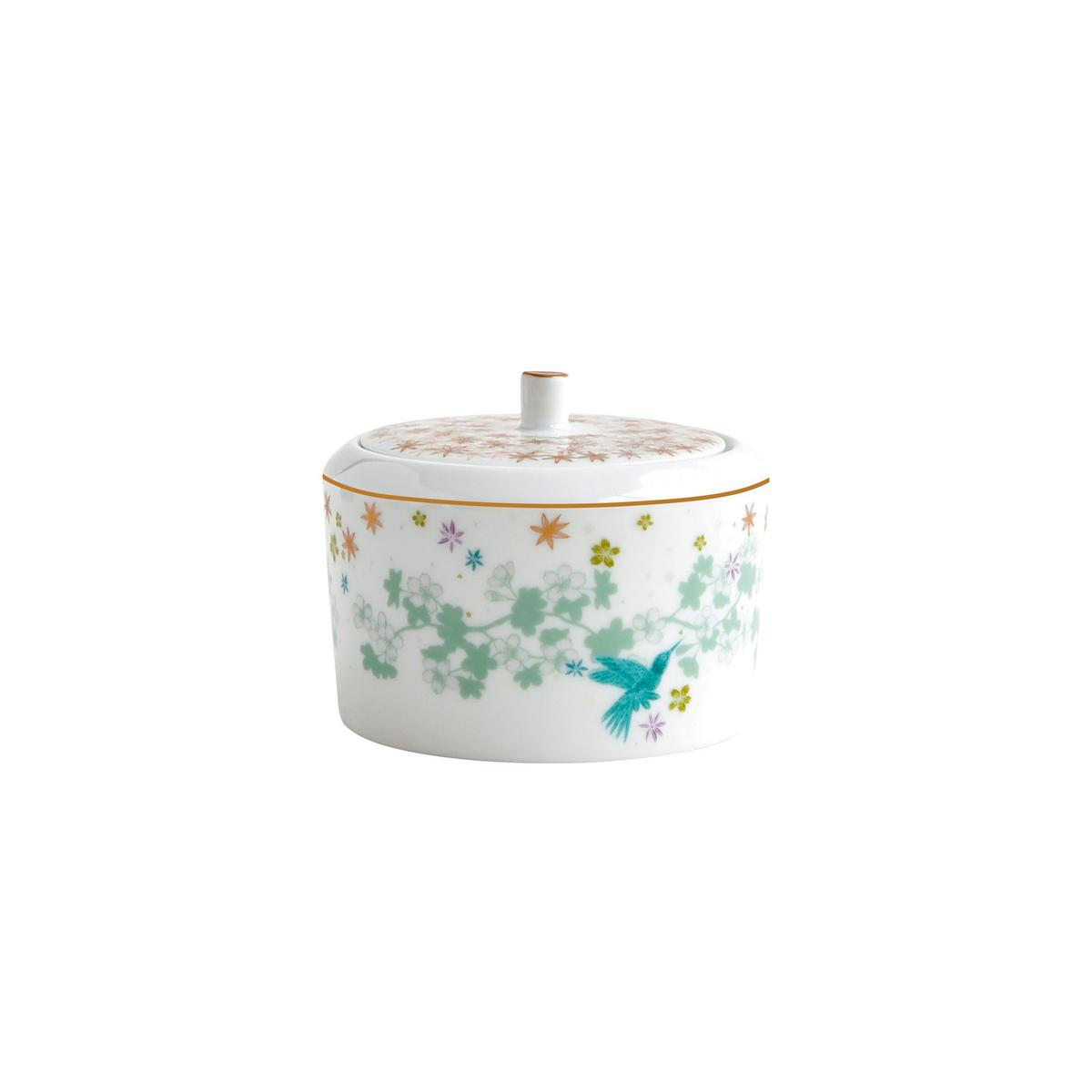 The "Féerie" dinner service by Bernardaud shows a design by the French artist Michaël Cailloux. About the collarboration with Bernaraud the artist says: "I wanted a festive, celestial and solar decor. An explosion of patterns like a firework. With a starry sky of small dandelion flowers, carrot flowers, clovers and wreaths of cherry blossoms. The hummingbird and the butterflies twirl, they are attracted by the light and the gold shards. A moving nature, joyful and bright."