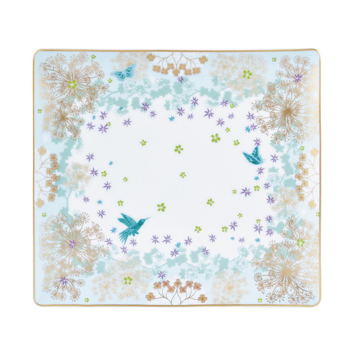 The "Féerie" dinner service by Bernardaud shows a design by the French artist Michaël Cailloux. About the collarboration with Bernaraud the artist says: "I wanted a festive, celestial and solar decor. An explosion of patterns like a firework. With a starry sky of small dandelion flowers, carrot flowers, clovers and wreaths of cherry blossoms. The hummingbird and the butterflies twirl, they are attracted by the light and the gold shards. A moving nature, joyful and bright."
