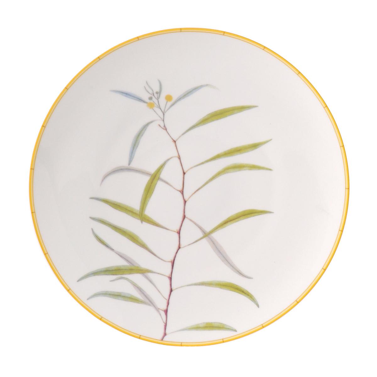 The delicate leaves and flowers are in subdued shades of green, curry yellow and warm red tones. The plates of the "Jardin Indien" from Bernardard are framed in a golden yellow border. Every piece is made of the finest Limoges porcelain.