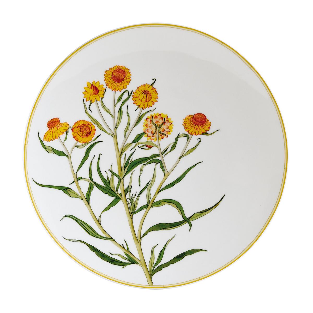The delicate leaves and flowers are in subdued shades of green, curry yellow and warm red tones. The plates of the "Jardin Indien" from Bernardard are framed in a golden yellow border. Every piece is made of the finest Limoges porcelain.