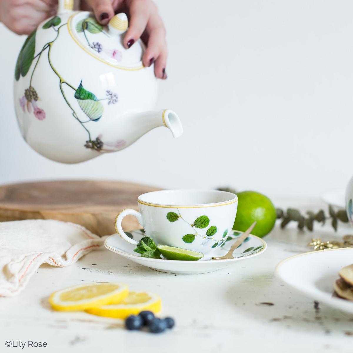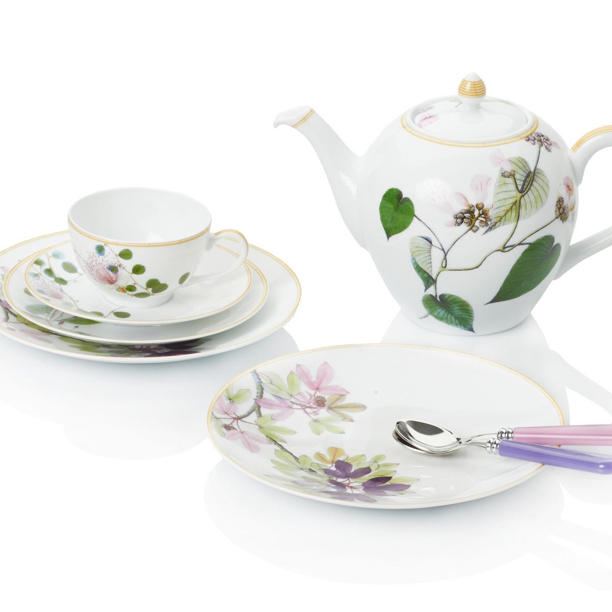 The delicate leaves and flowers are in subdued shades of green, curry yellow and warm red tones. The plates of the "Jardin Indien" from Bernardard are framed in a golden yellow border. Every piece is made of the finest Limoges porcelain.