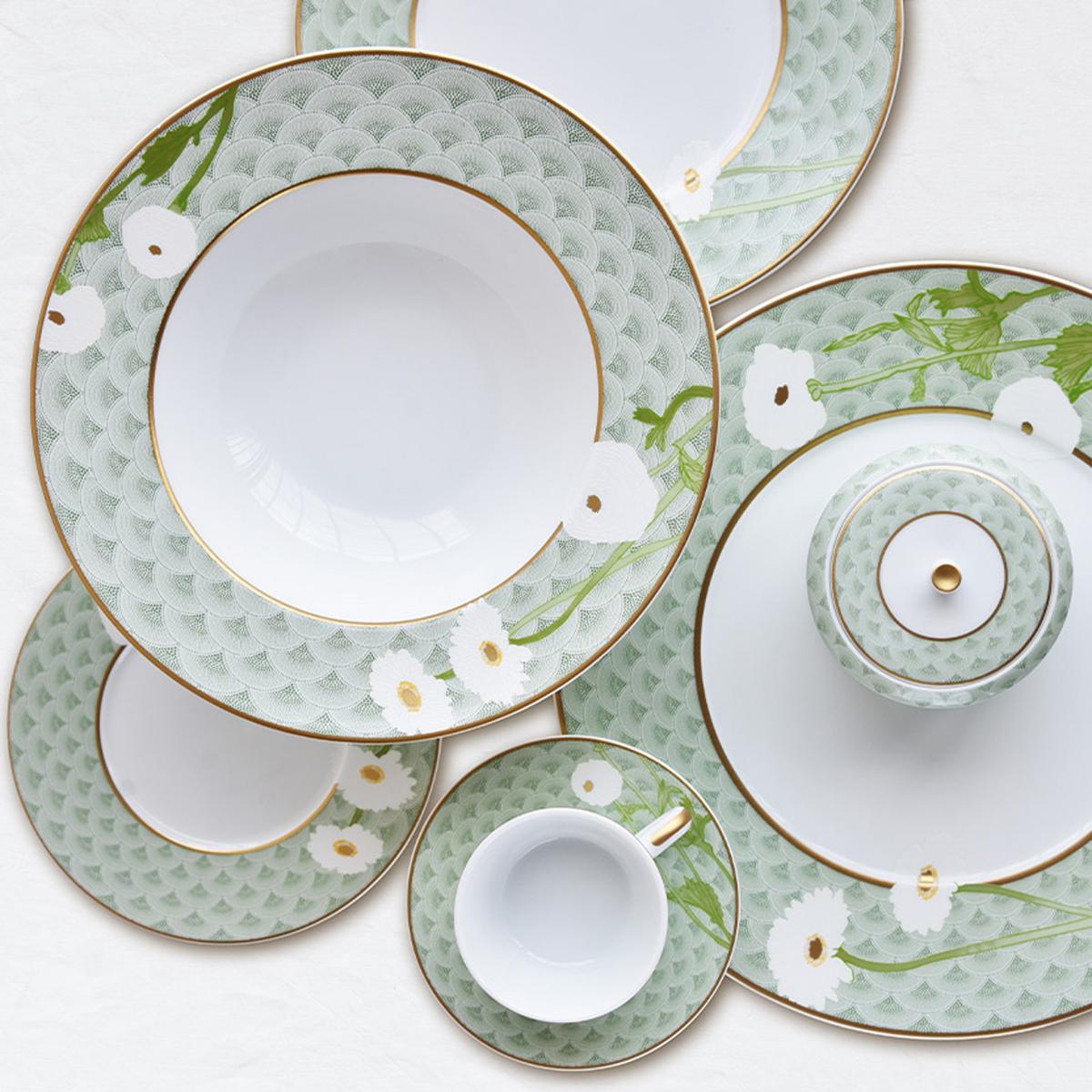 The "Praiana" dinnerware by Bernardaud is a homage to Art Nouveau, which is currently being rediscovered and interpreted by many interior designers. The fine Limoges porcelain shows an Art Nouveau decor in delicate lime green combined with a contemporary, naturalistic flower motif in fresh green and bright white. The golden borders lend "Praiana" a luxurious appearance.