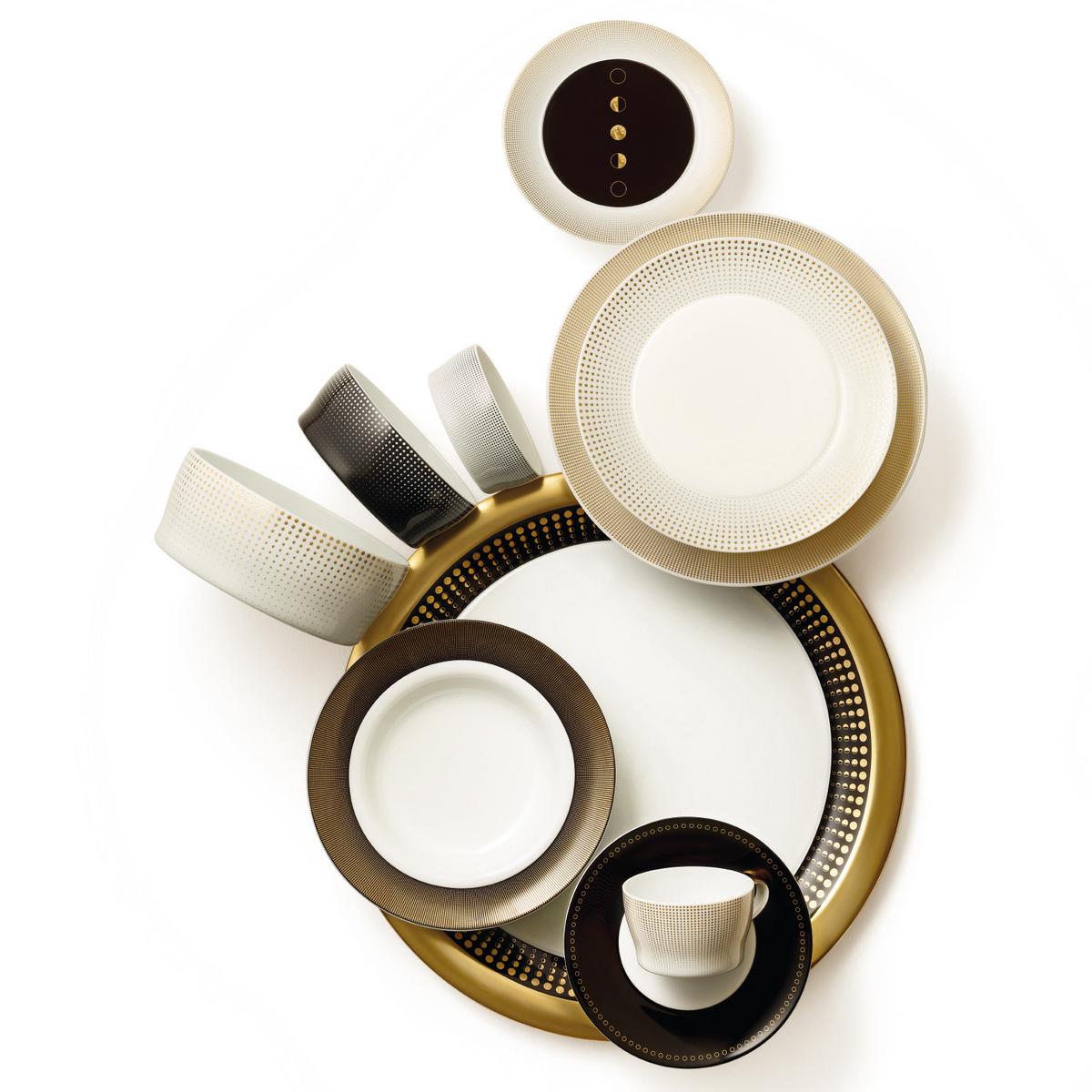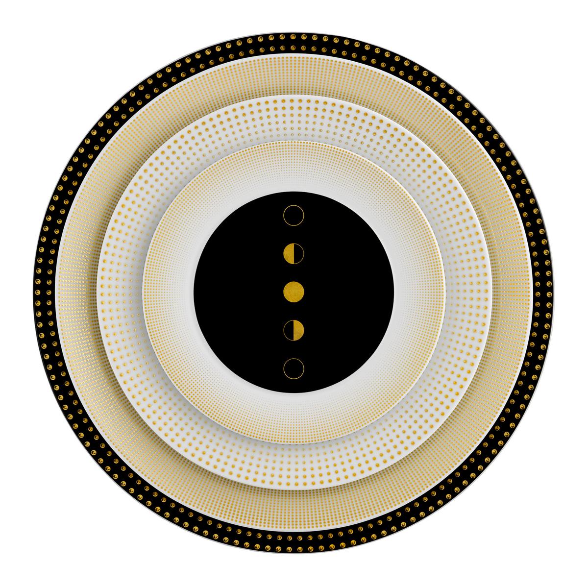 The "Clair de Lune" pattern splendidly builds on what provided the Korean ceramic master Kap-Sun Hwang with the inspiration for the basic "Auréole" form, namely the sun and moon. The shapes reflect classic to Asian styles. On the seemingly featherlight porcelain, the different phases of the moon are reflected. The centre of the plate is slightly raised – which also slightly raises the food served on them, thus clearly making it the focal point.