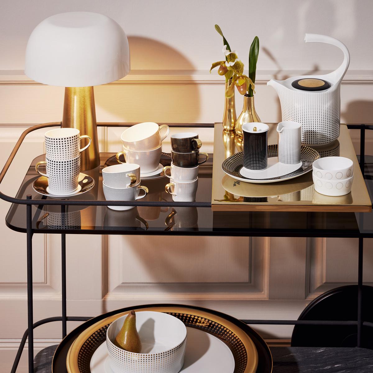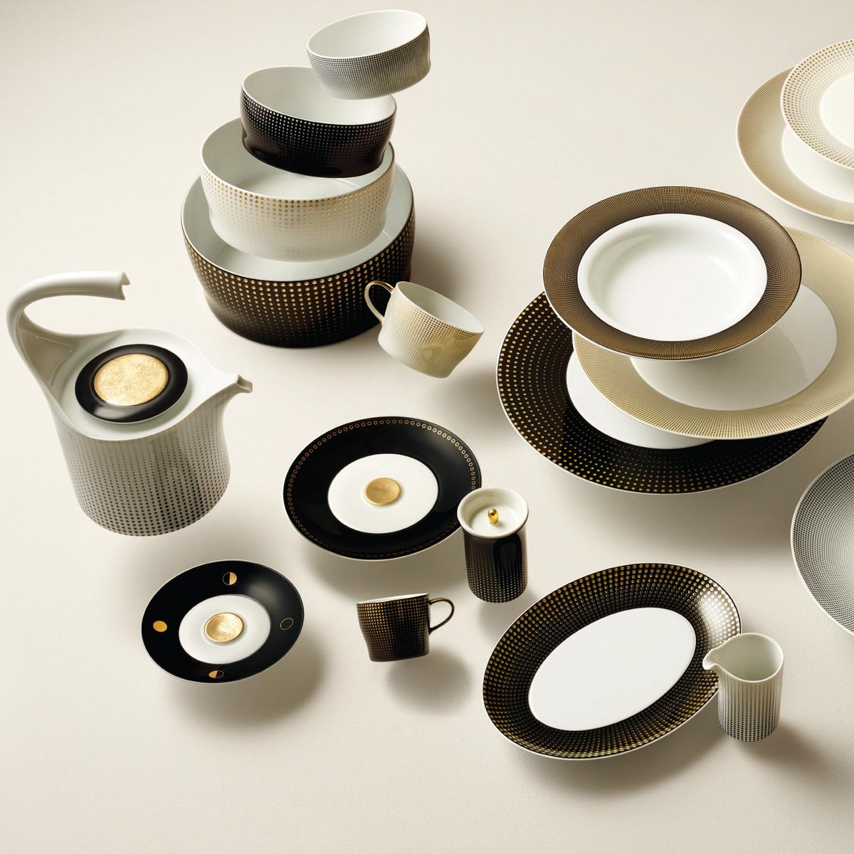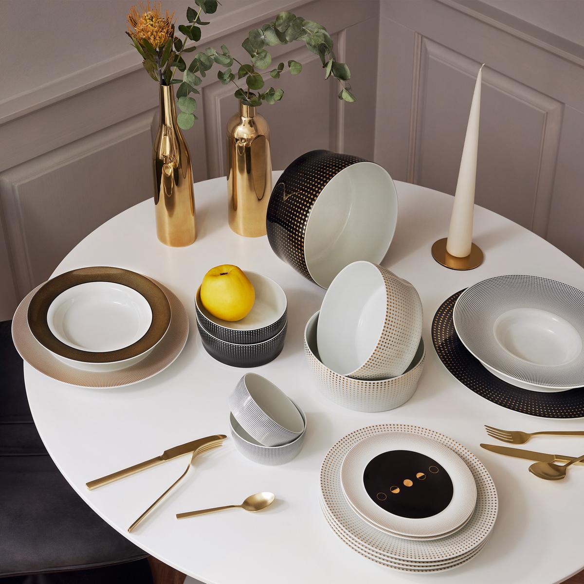 The porcelain service "Auréole – Clair de Lune" from Fuerstenberg is mysterious, magical and romantic all at the same time. The moon has fascinated humanity for hundreds of years. The magical gravitational force of the moon transforms itself on this high-quality porcelain into extraordinary compositions in 24-carat gold, black and white. Thanks to the different presentations of the moon, "Auréole – Clair die Lune" creates ever new "snapshots" that immerse each piece in a timeless light.