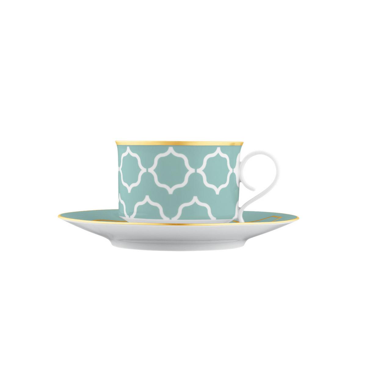 The "Carlo Dal Bianco" porcelain is available in a variety of different styles. This "Este" design is particularly eye-catching. Powdery turquoise and luxurious gold shades are used for the central motif and larger spiral-shaped pattern. As the name suggests, the pattern has an Oriental flair which goes well with the modern and light lines of the dinner service. The result is a totally new, contemporary interpretation of traditional motifs.