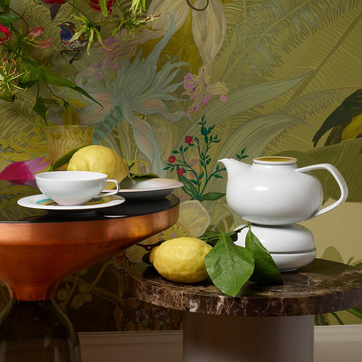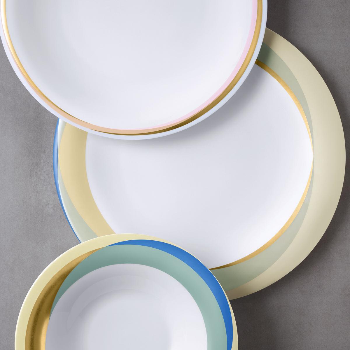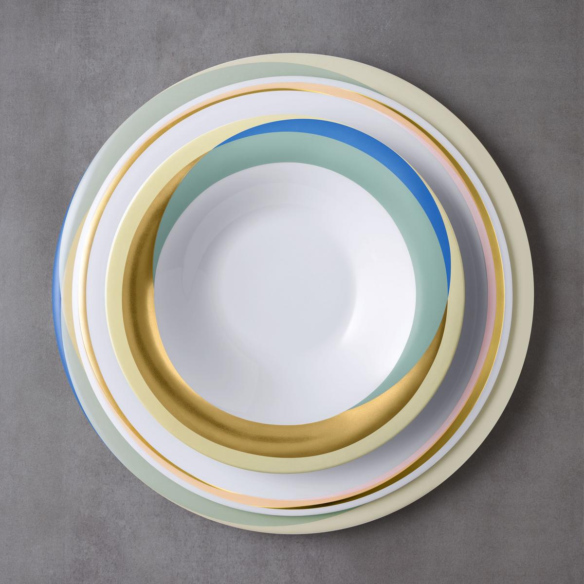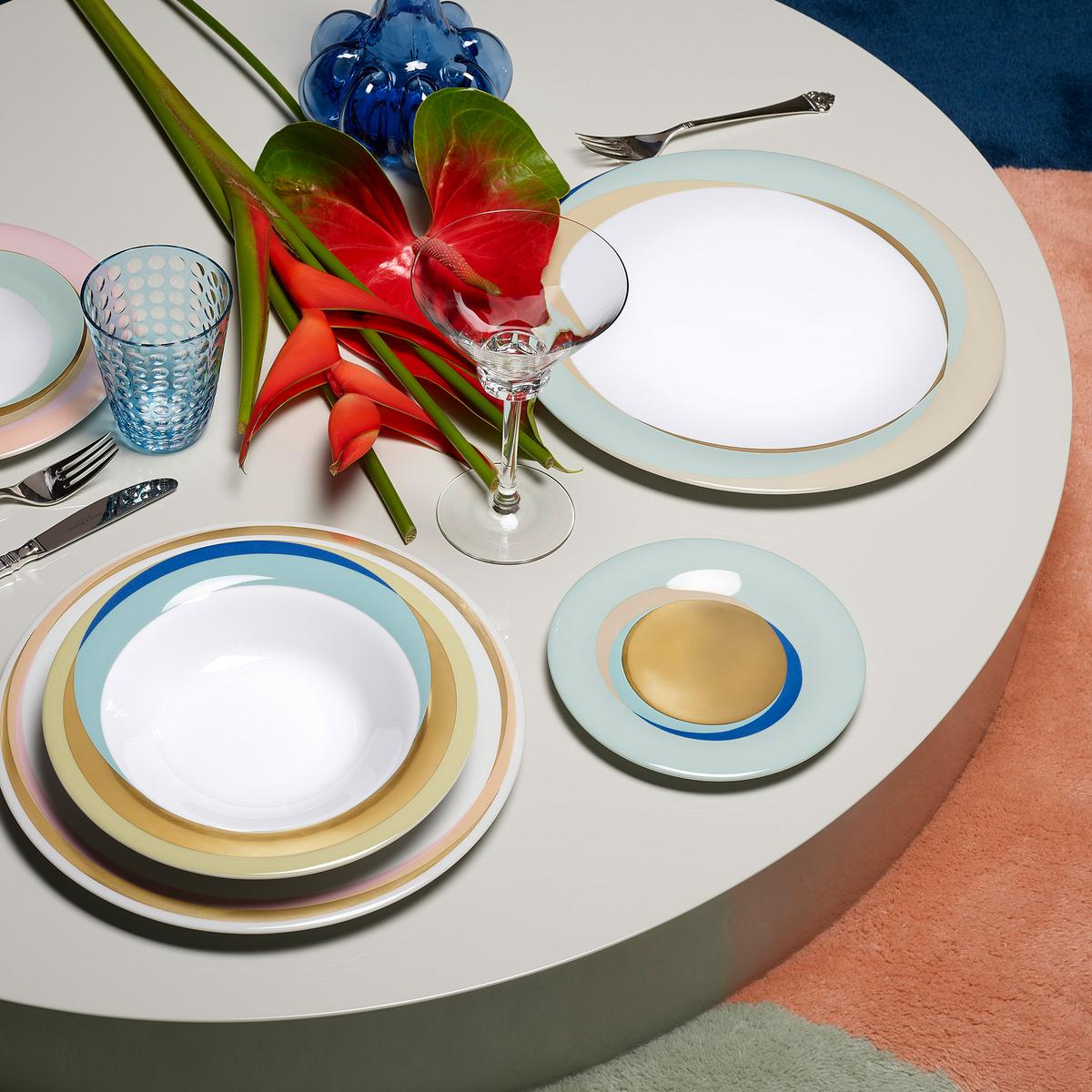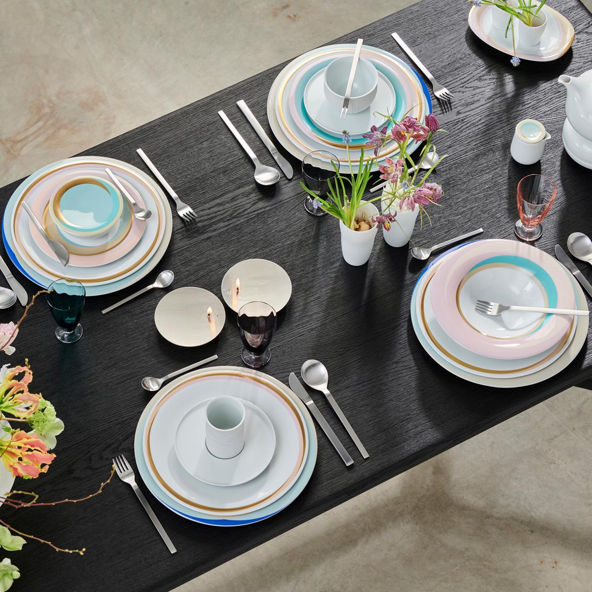 "Fluen ‒ Shifting Colours" is the result of creative collaboration between the porcelain manufacturer Fuerstenberg and the international designer Alfredo Häberli. Here they have produced an exceptional porcelain service with a wonderfully fluid and highly distinctive design. "Shifting Colors" is a tasteful colour arrangement based on a number of coloured areas which - when they overlap each other – create new colours. Luminous blue, powerful gold and gentle pastel tones combine to produce a fascinating effect.