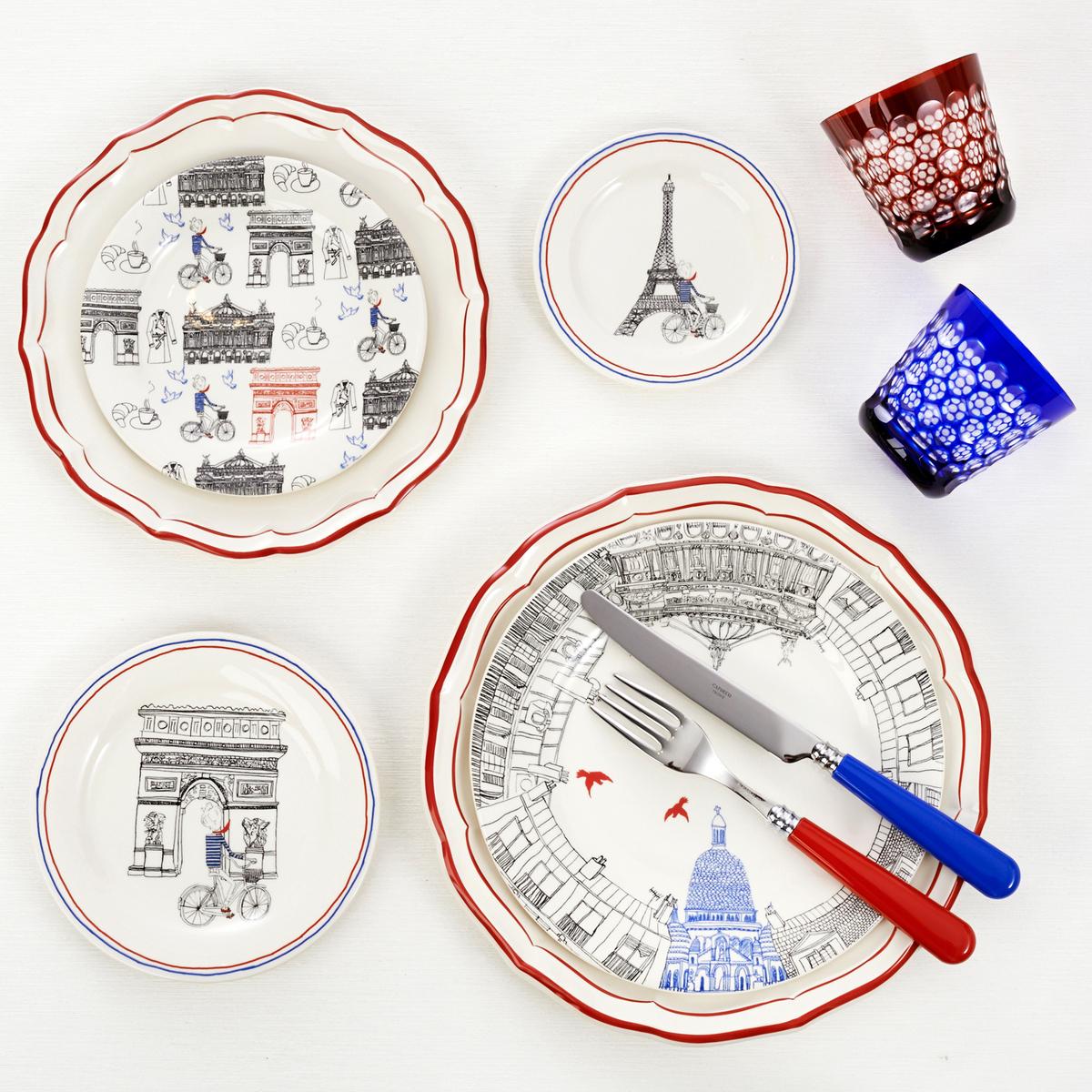 The collection highlights the beauty of Paris in timeless design, guiding us through landmark monuments: the Arc de Triomphe, the Opera, the Sacré Coeur and the Eiffel Tower, and at the same time, picks out other aspects that contribute to the inimitable charm of Paris, like the well-known bistro chairs outside street cafés, the Art Nouveau entrances to the metro stations and even an archetypal Parisian girl on a bicycle. The French national colours contrast in an eye-catching way with the black and white, and impressively underscore the graphic presentation in Gien’s "Ca c’est Paris".