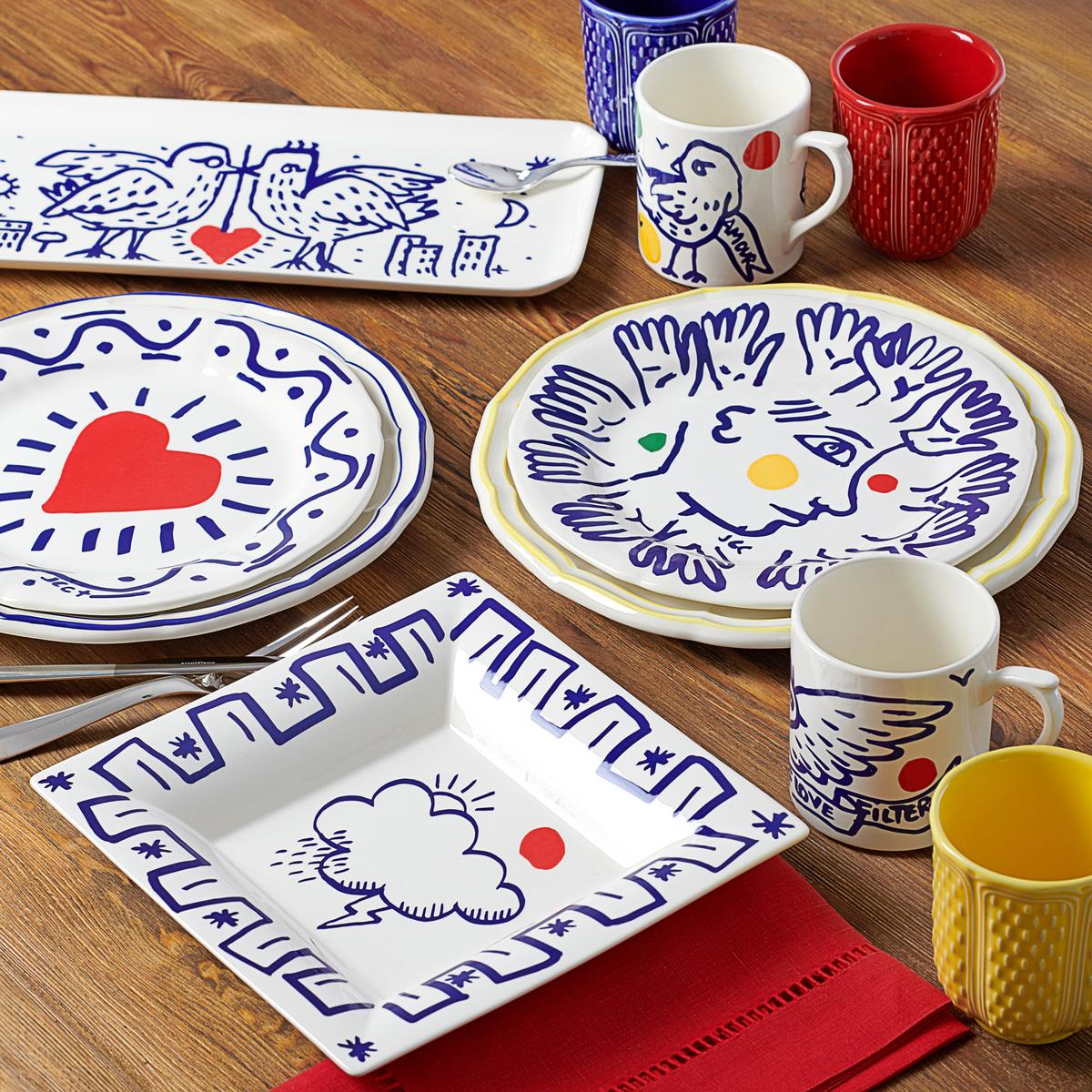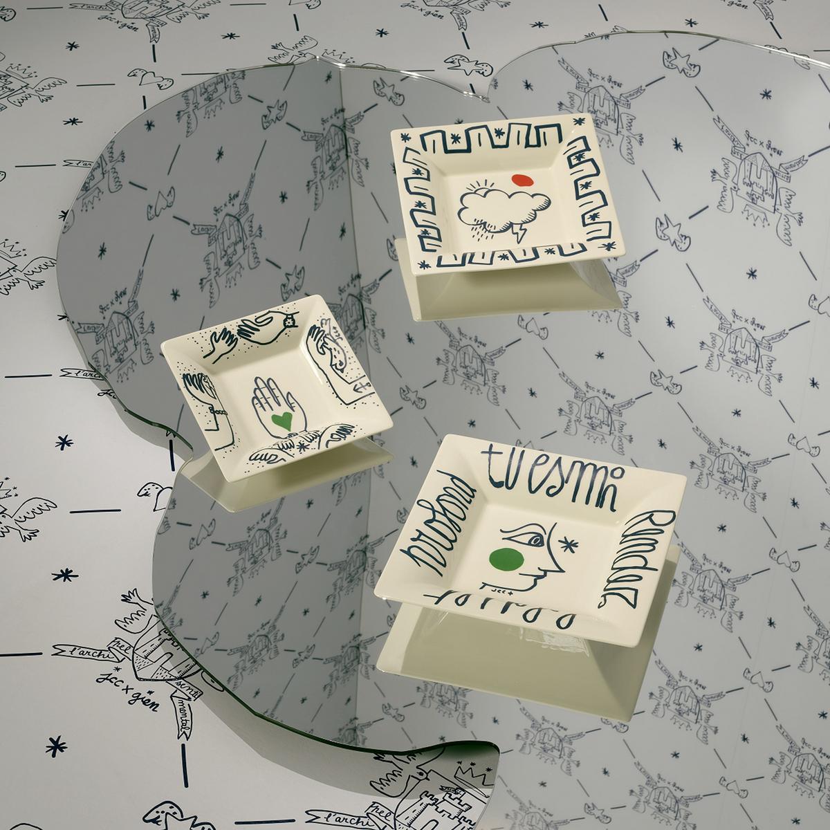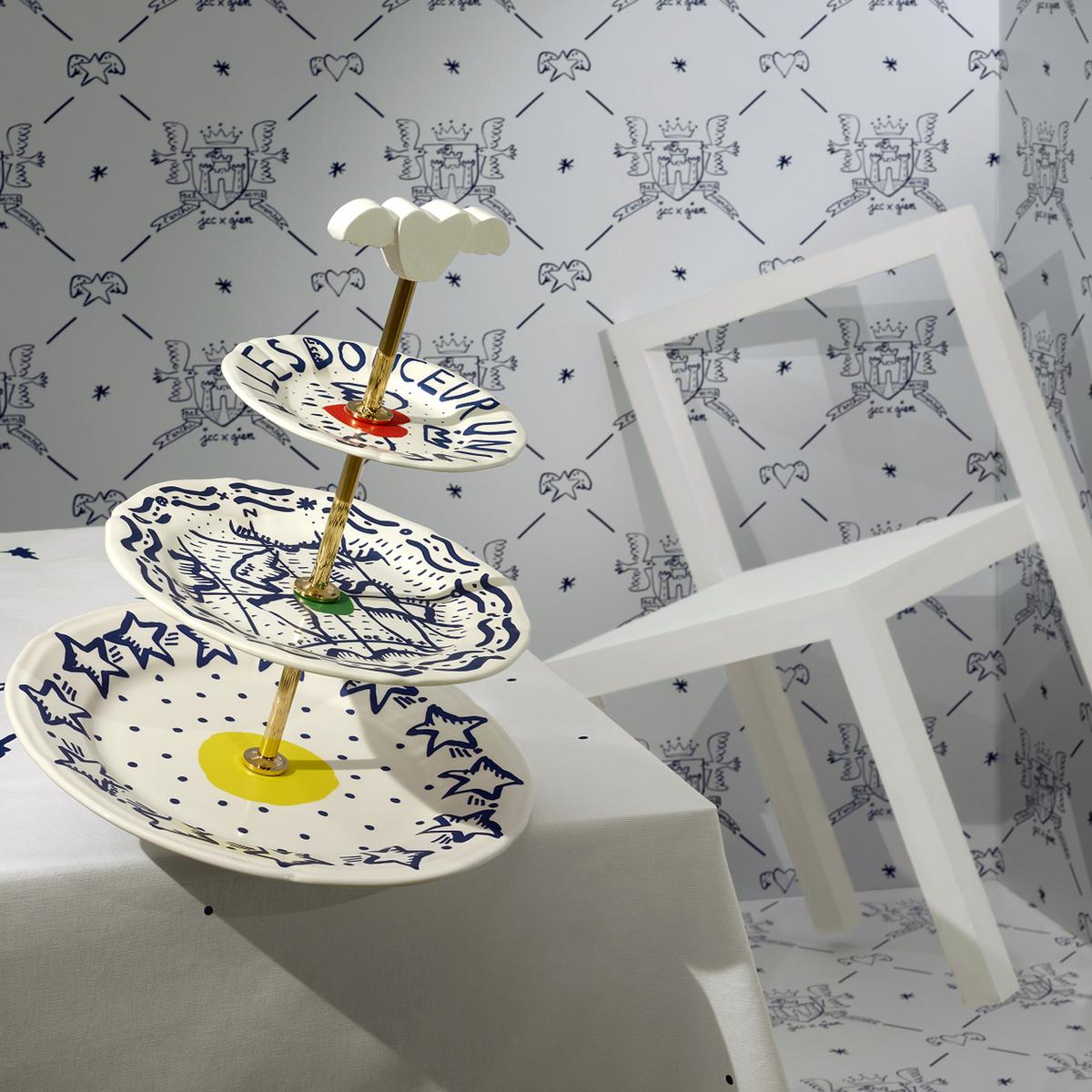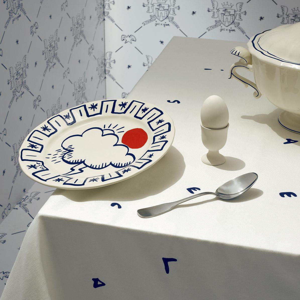 De Castelbajac chose Gien's historic shade of blue as the main colour for his expressionist designs to connect his ideas with the manufactory's long history. Bold colour patches in red, green and yellow add his signature radical colourfulness. Together with the nostalgic nature of faience dinnerware, the décors awaken forgotten memories and feelings from childhood. Flamboyant, radical, emotional – "L'Archipel Sentimental" is a loud yes to life.
