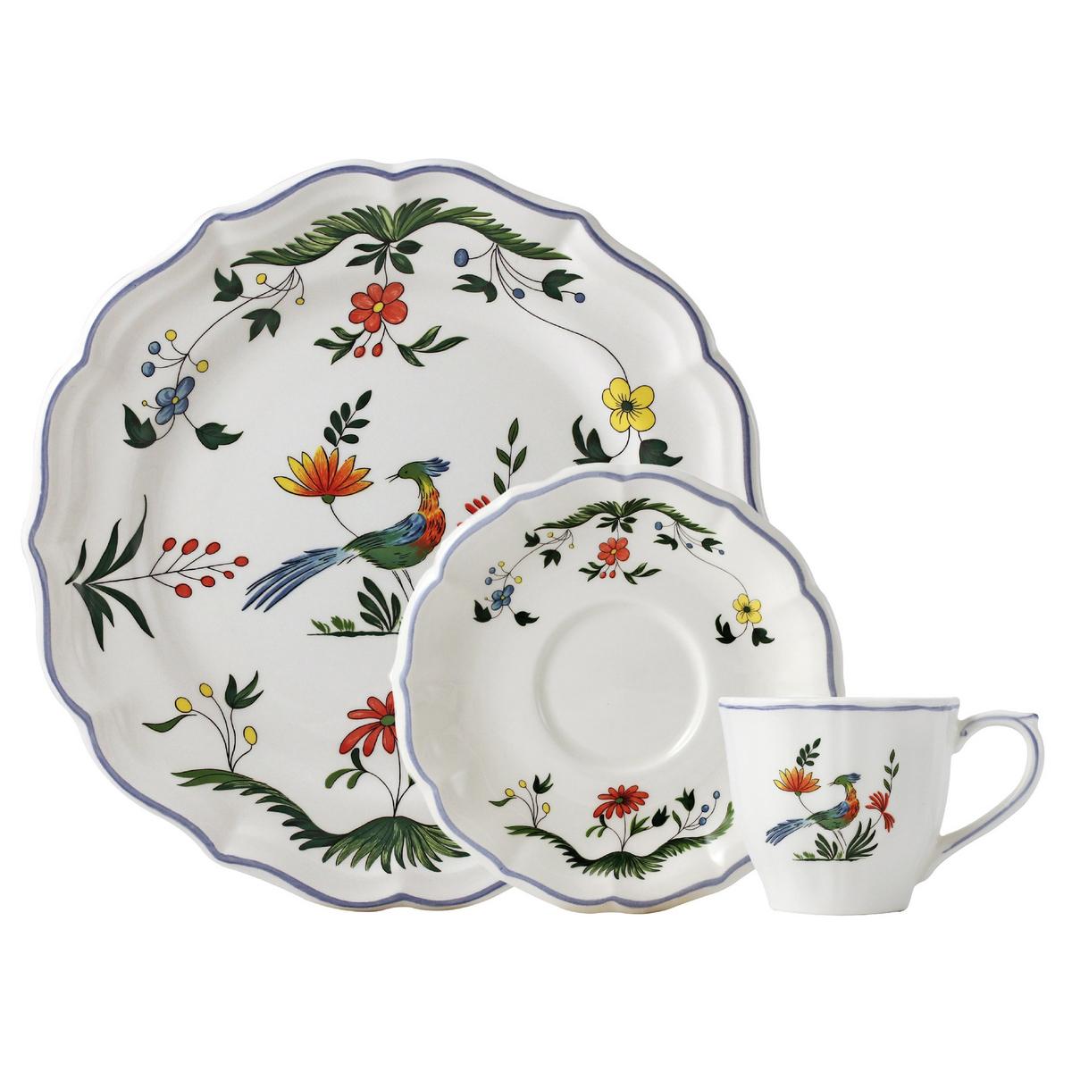 The "Oiseaux de Paradis" dinner service by Gien immortalizes motifs of traditional Chinese porcelain on finest French faience. Designed by Jacques Olerys for Gien in the eighteenth century, the main theme of this dinnerware is a colourful bird set against a backdrop of fanciful flora.