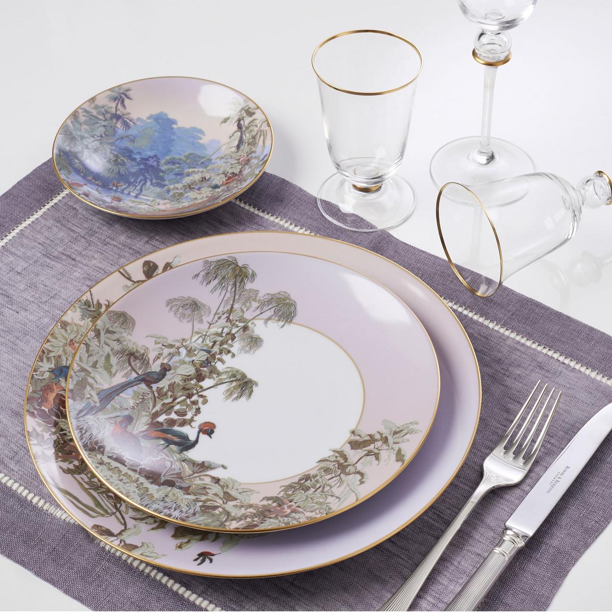 Exotic birds with colourful feathers, flamingos and beautiful vegetation adorn the "Le Brésil" dinnerware by Haviland. You will find yourself dreaming of distant shores and of journeys to exciting countries. "Le Brésil" from Haviland offers a superb panorama of an exotic animal and plant world framed in rims of fine gold.