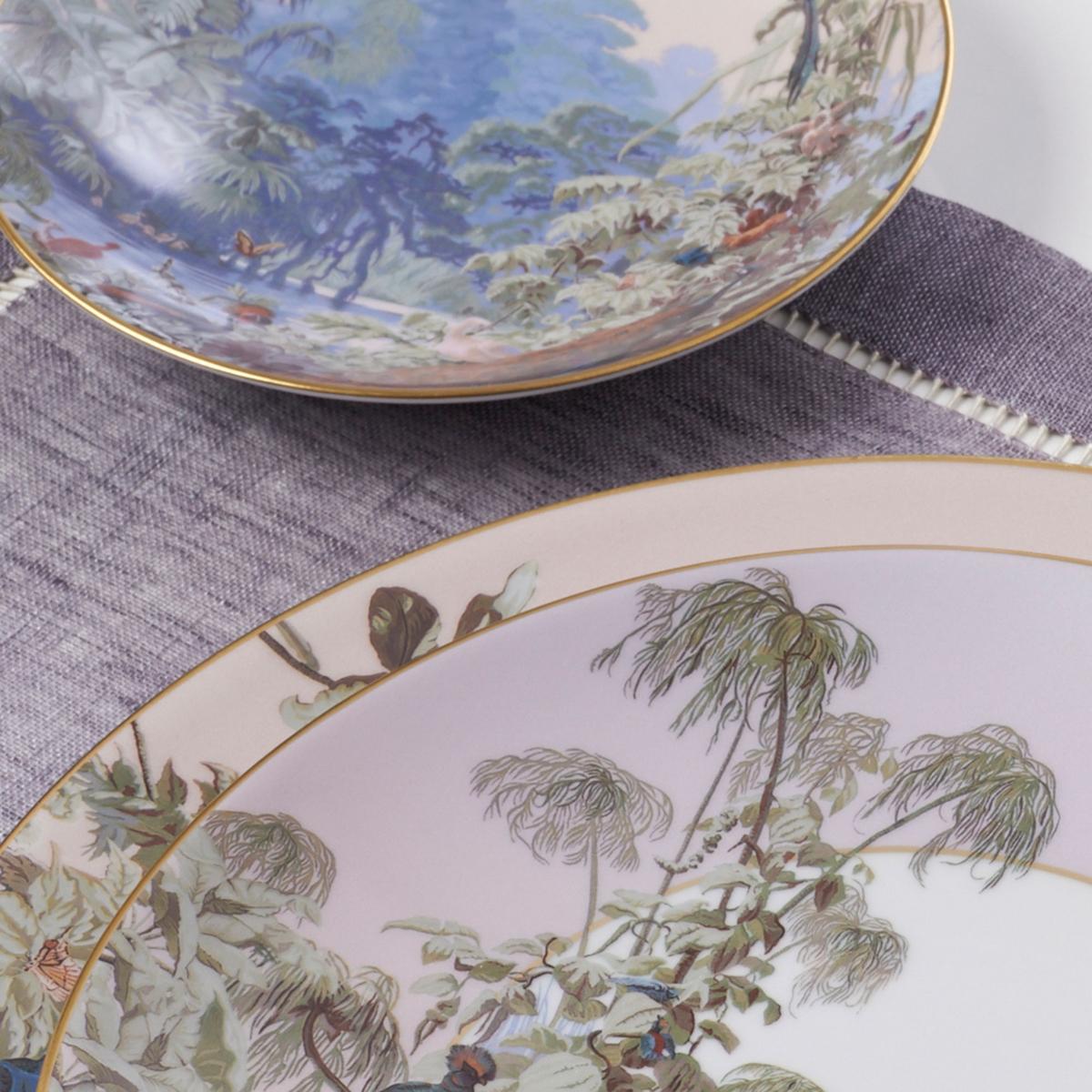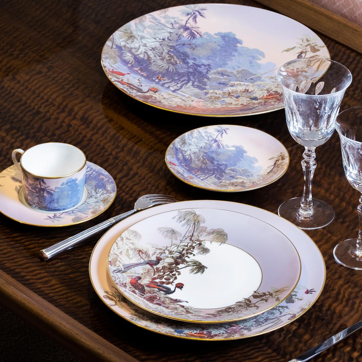 The "Le Brésil" dinnerware is made of Limoges porcelain and was conceived in 2013 thanks to the collaboration between the porcelain manufacturer Haviland and another French manufacturer, Zuber. Zuber produces high-quality wallpaper, fabrics and murals with superb motifs. The teamwork and expertise of these two successful French manufacturers have produced this exquisite porcelain service.