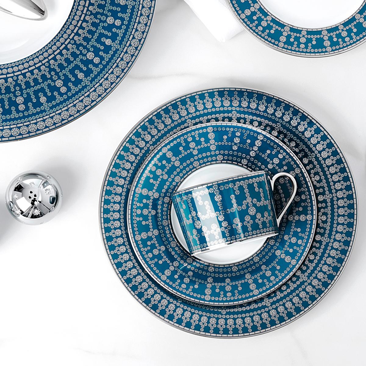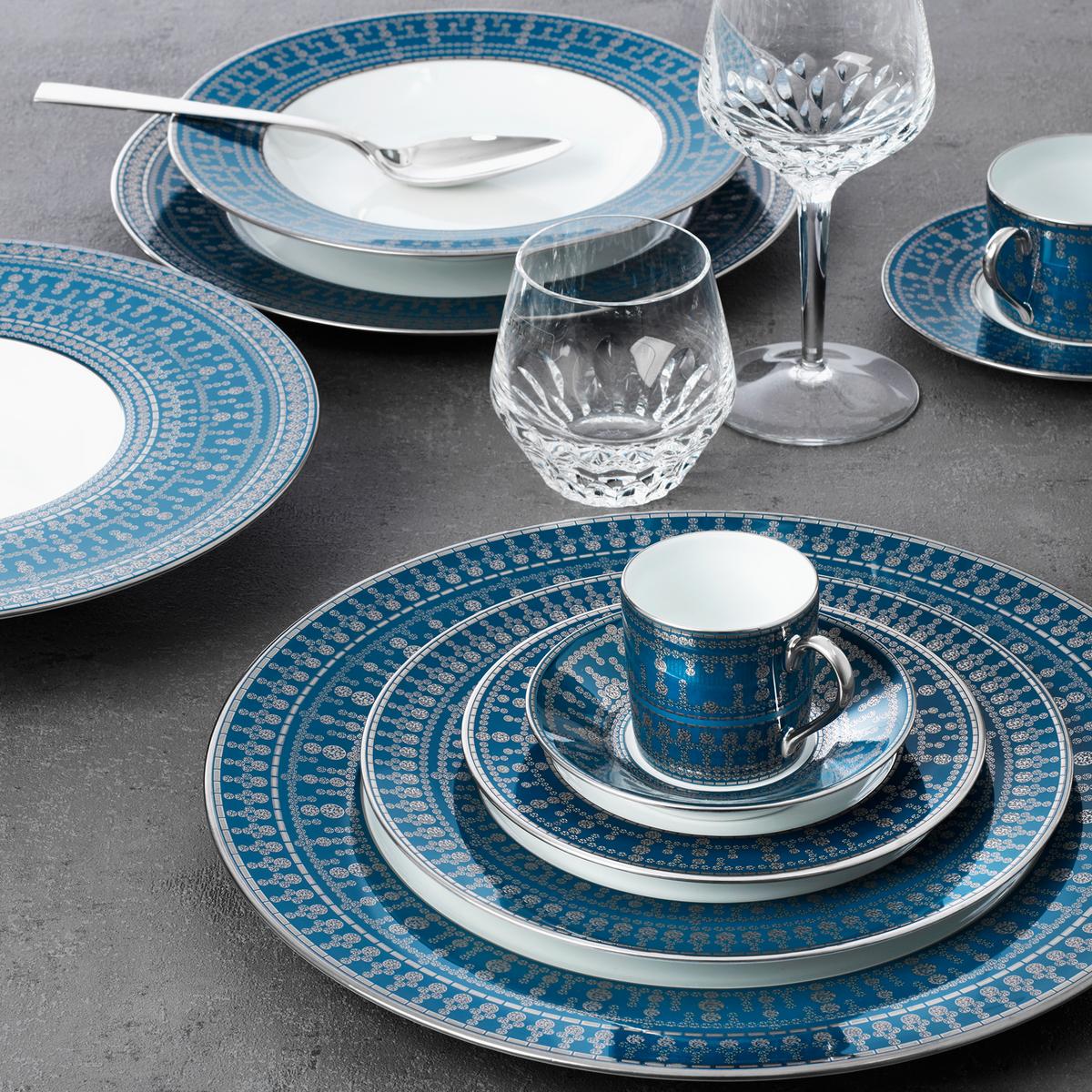Haviland, a leading porcelain manufacturer, presents an exceptional design on Limoges porcelain with "Tiara". The "Tiara" dinnerware displays a wonderful pattern, reminiscent of a diamond-studded coronet. A tiara, a jewelled ornamental band worn by women on formal social occasions, is often adorned with precious stones and diamonds. The interplay of blue and platinum is very refined. Each piece of the "Tiara" dinner service is manufactured in the renowned French porcelain factory Haviland and refined with platinum.
